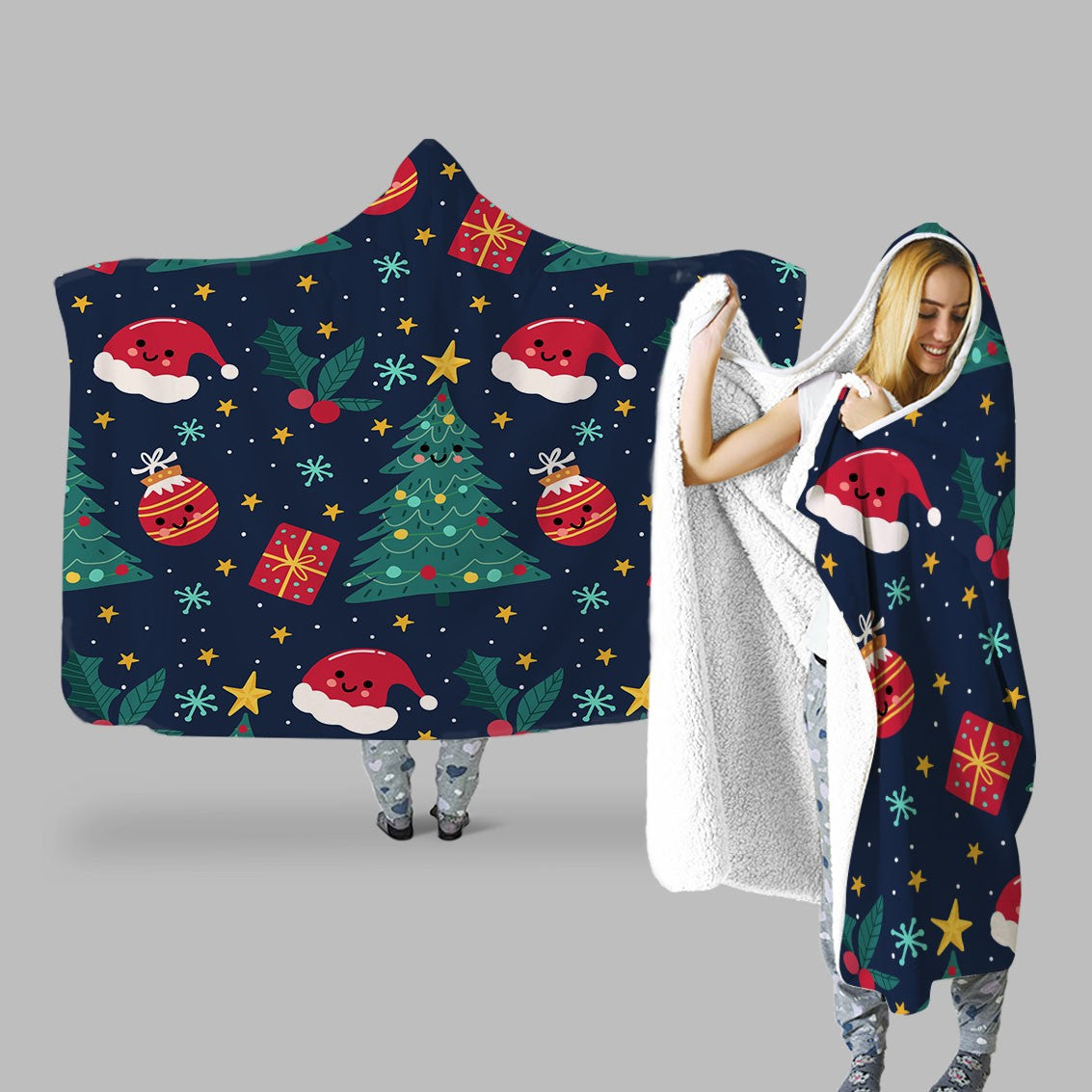 Christmas Tree Hat Texture Patterns Blue Personalized Hooded Throw Blanket Fleece Hoodie Cape