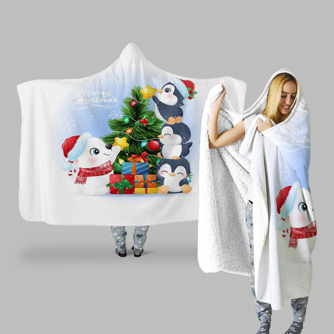 Christmas Tree Penguins Kids Animal Blue Personalized Hooded Throw Blanket Fleece Hoodie Cape