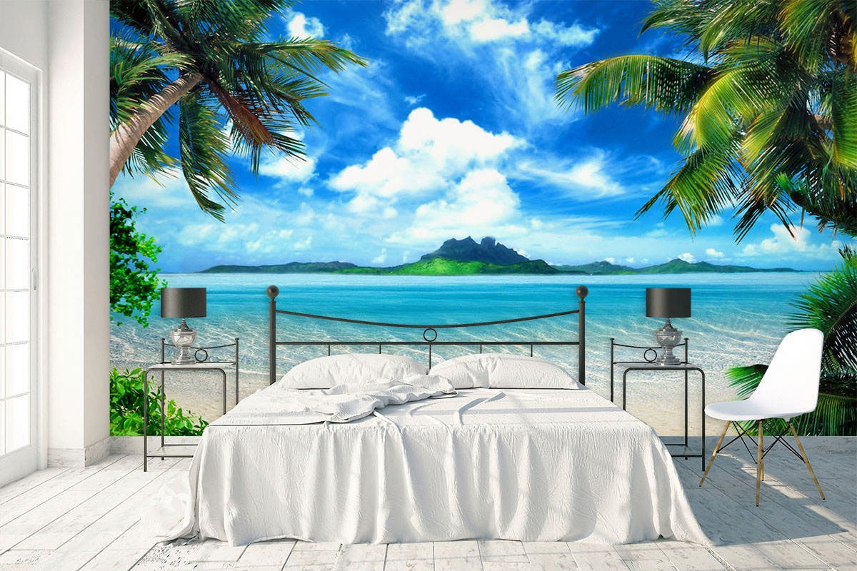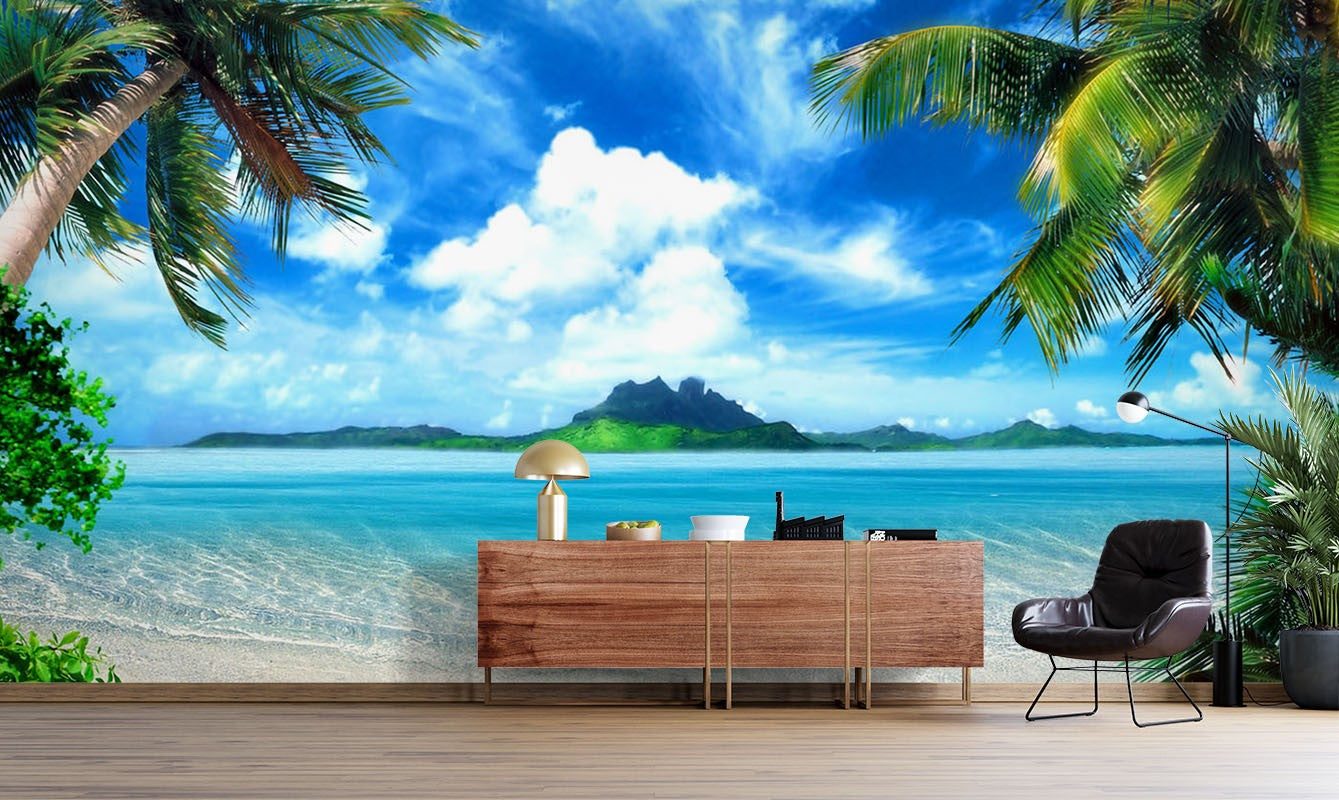 Coconut Tree Beach Blue Wallpaper Mural,Self-Adhesive Peel And Stick 3D Wall Art,Australian Company Removable Wall Decor
