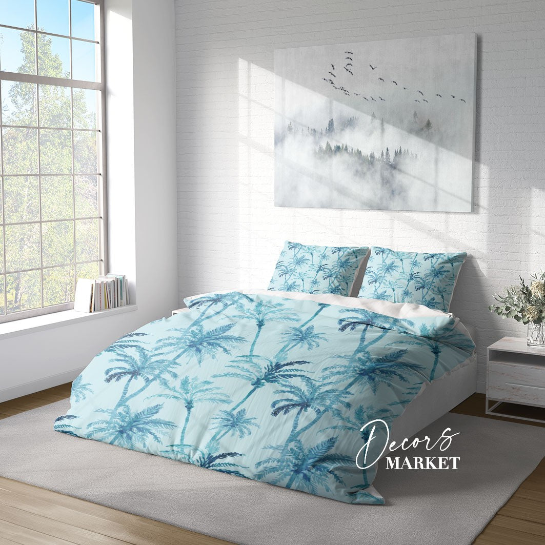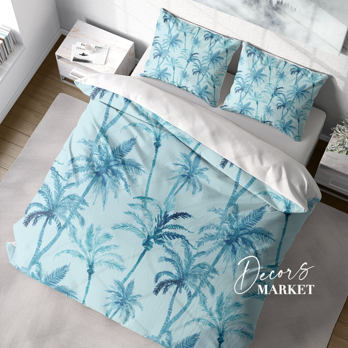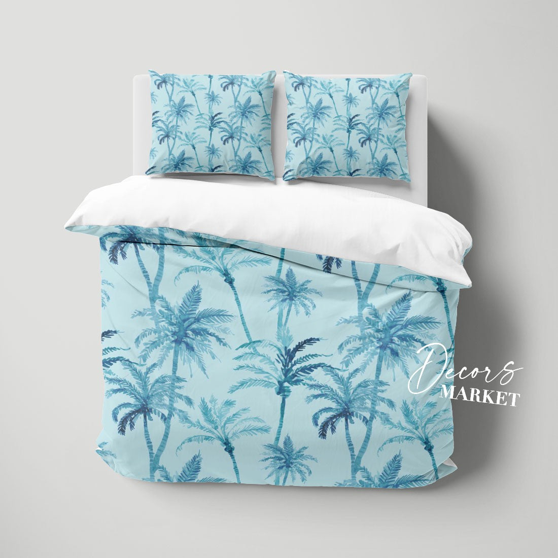Coconut Tree Duvet Cover Set w Pillowcases, Blue Tropical Floral Leaves 3D Quilt Cover, 3pc Single Double Queen King Size Doona Cover