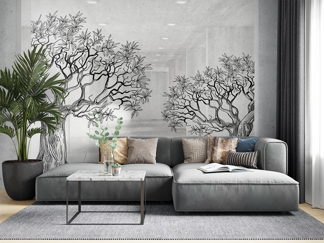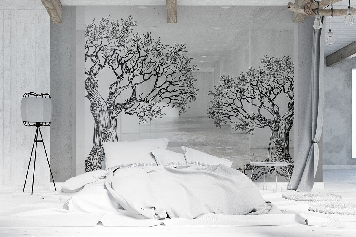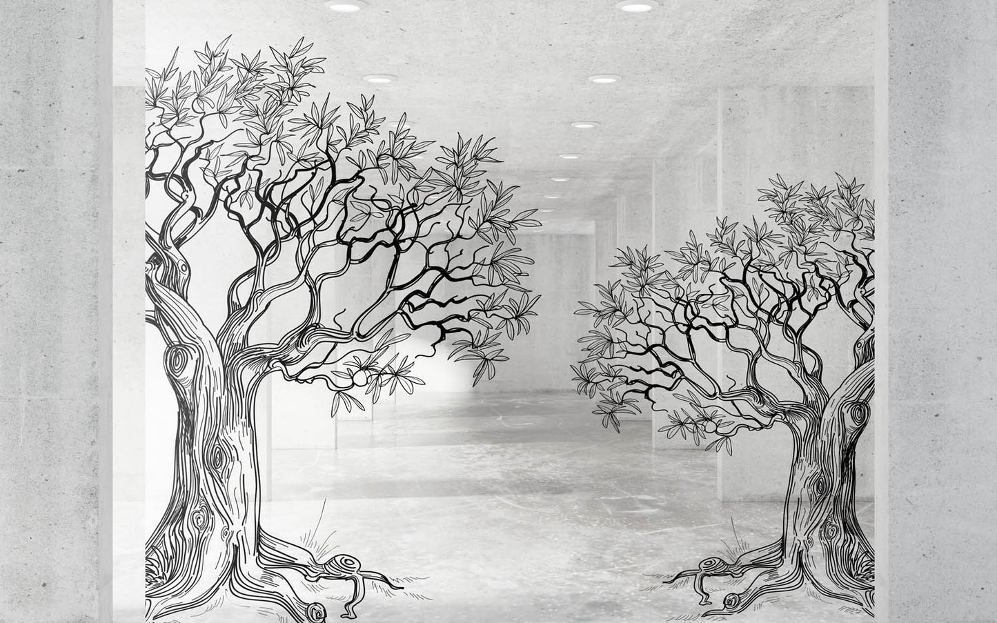 Concrete Hallway Trees Texture Surfaces Black And White Wallpaper Mural