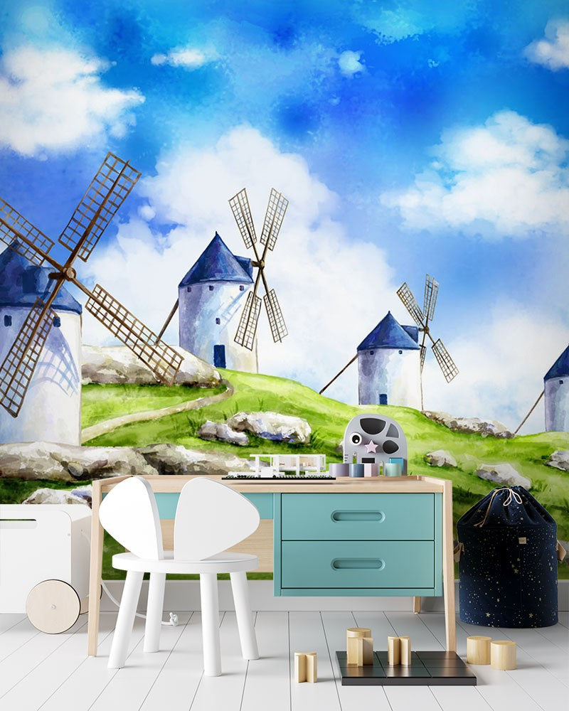 Country Windmills Art For Kids Blue Wallpaper Mural,Self-Adhesive Peel And Stick 3D Wall Decor,Designer Bedroom Wall Decor