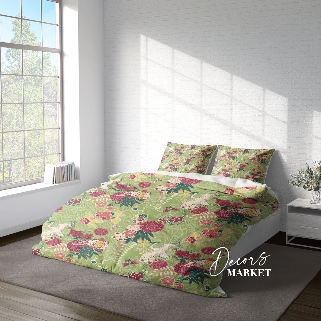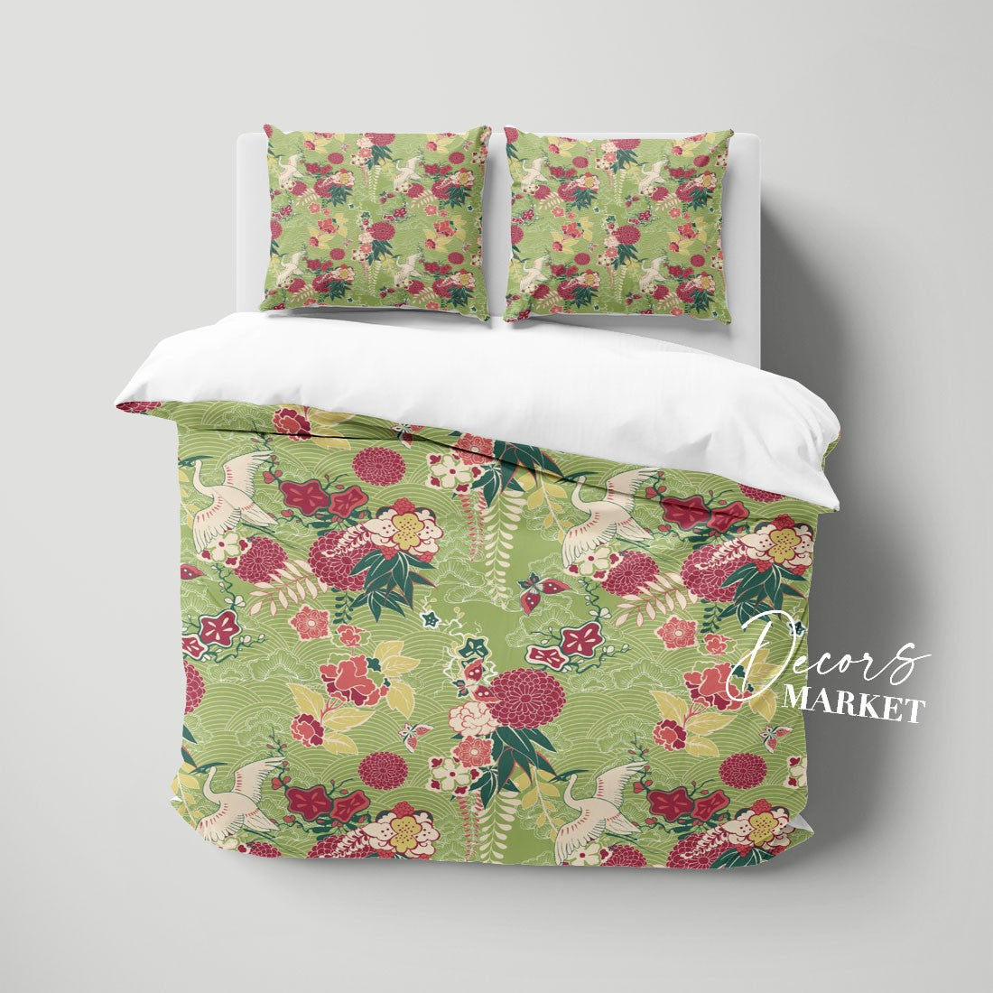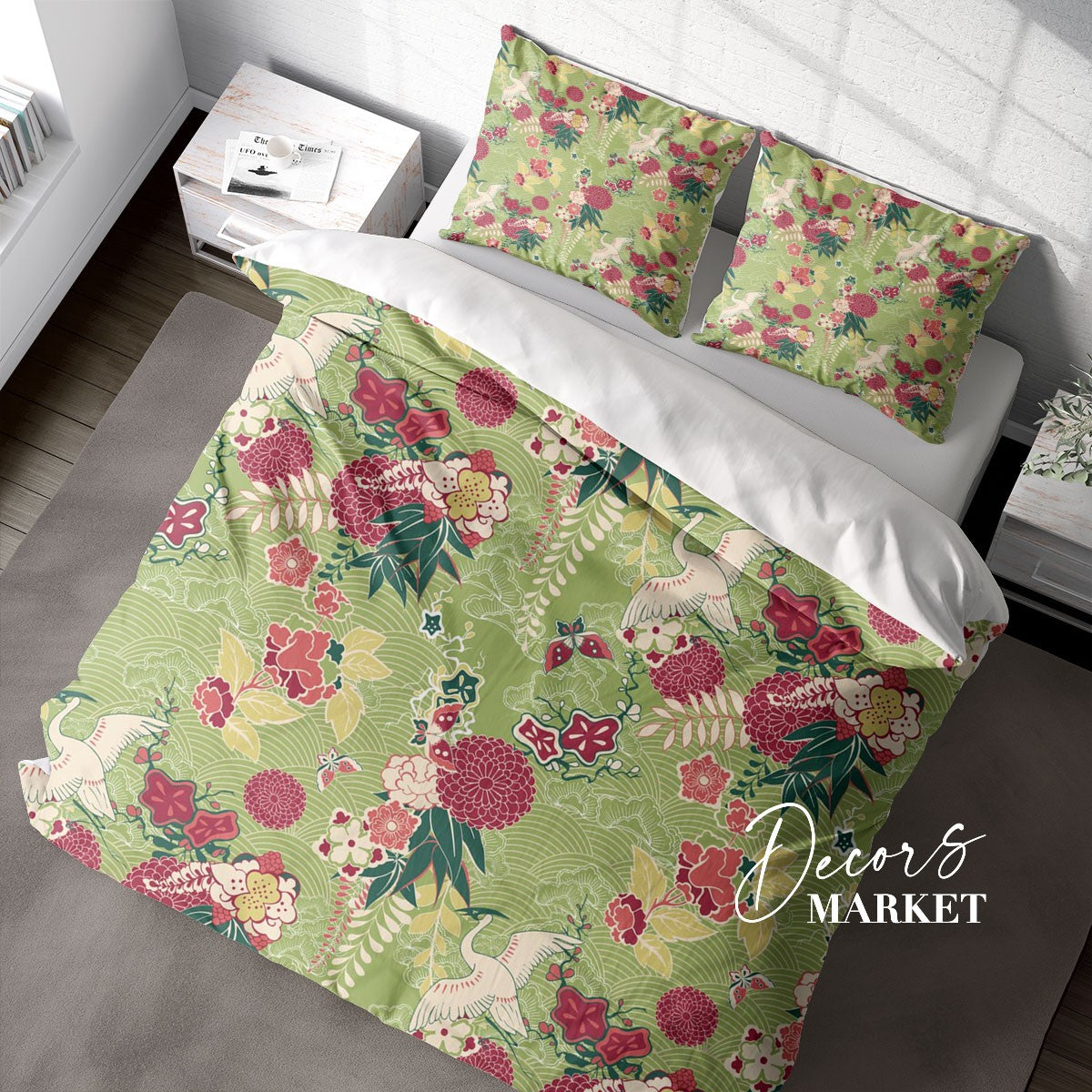 Crane Blossom Duvet Cover Set w Pillowcases, Green Floral Patterns 3D Quilt Cover, 3pc Single Double Queen King Size Doona Cover