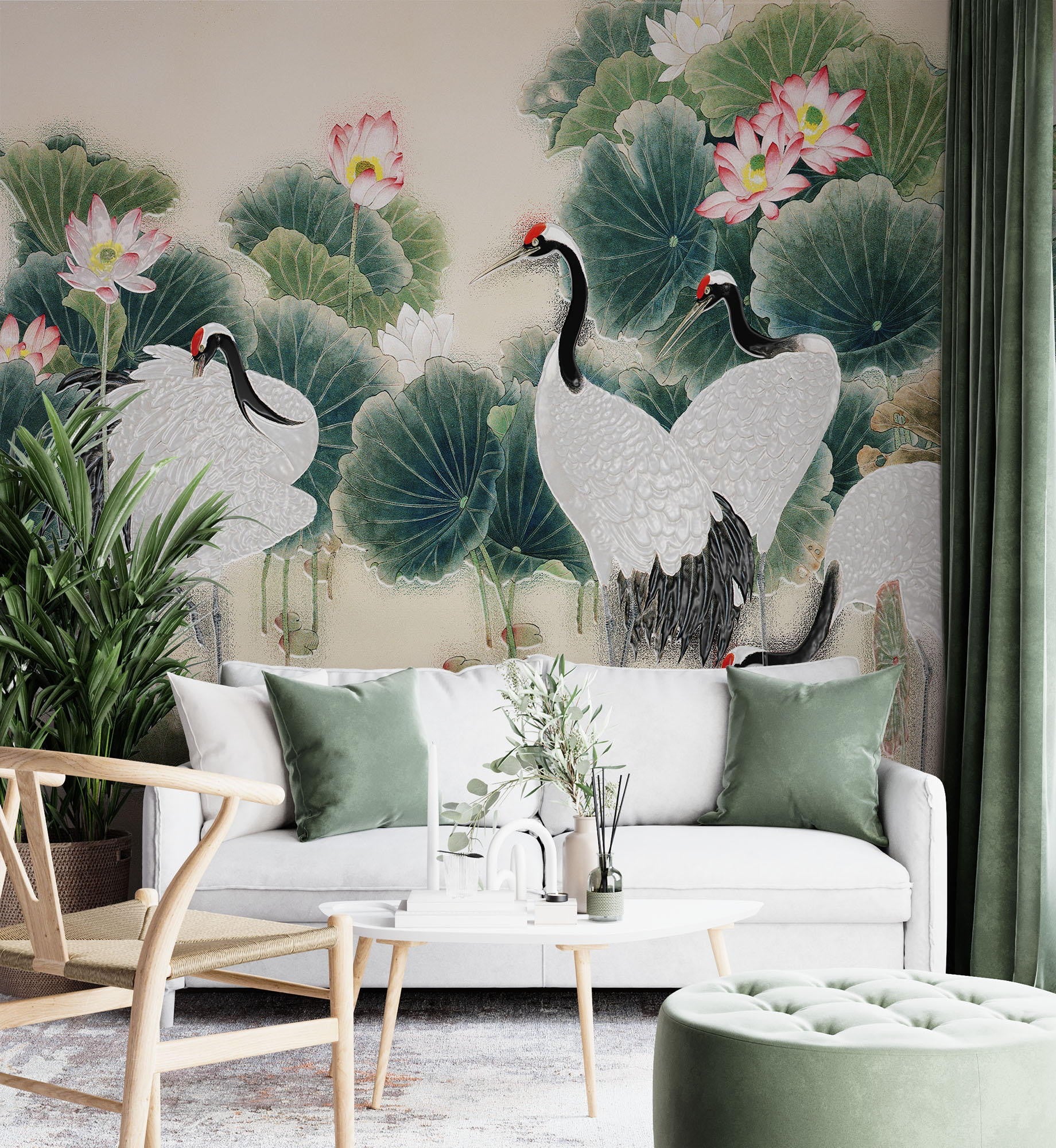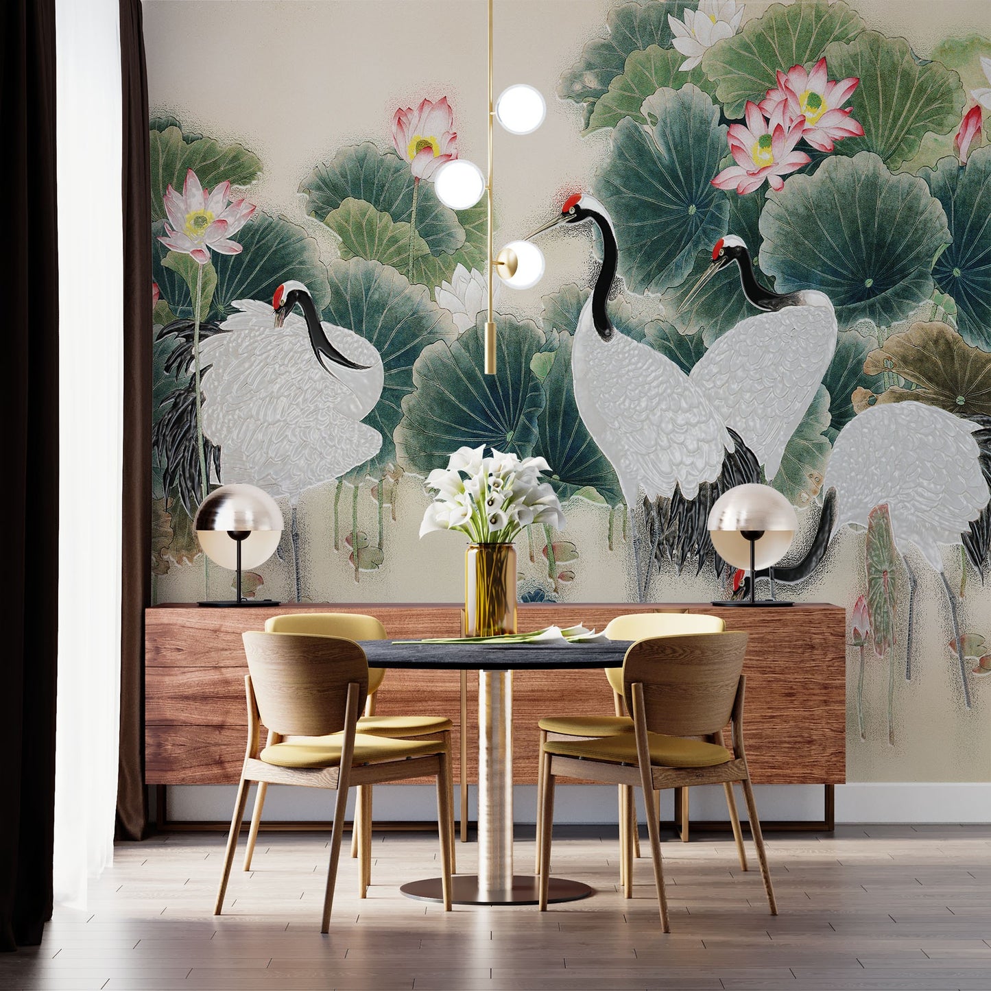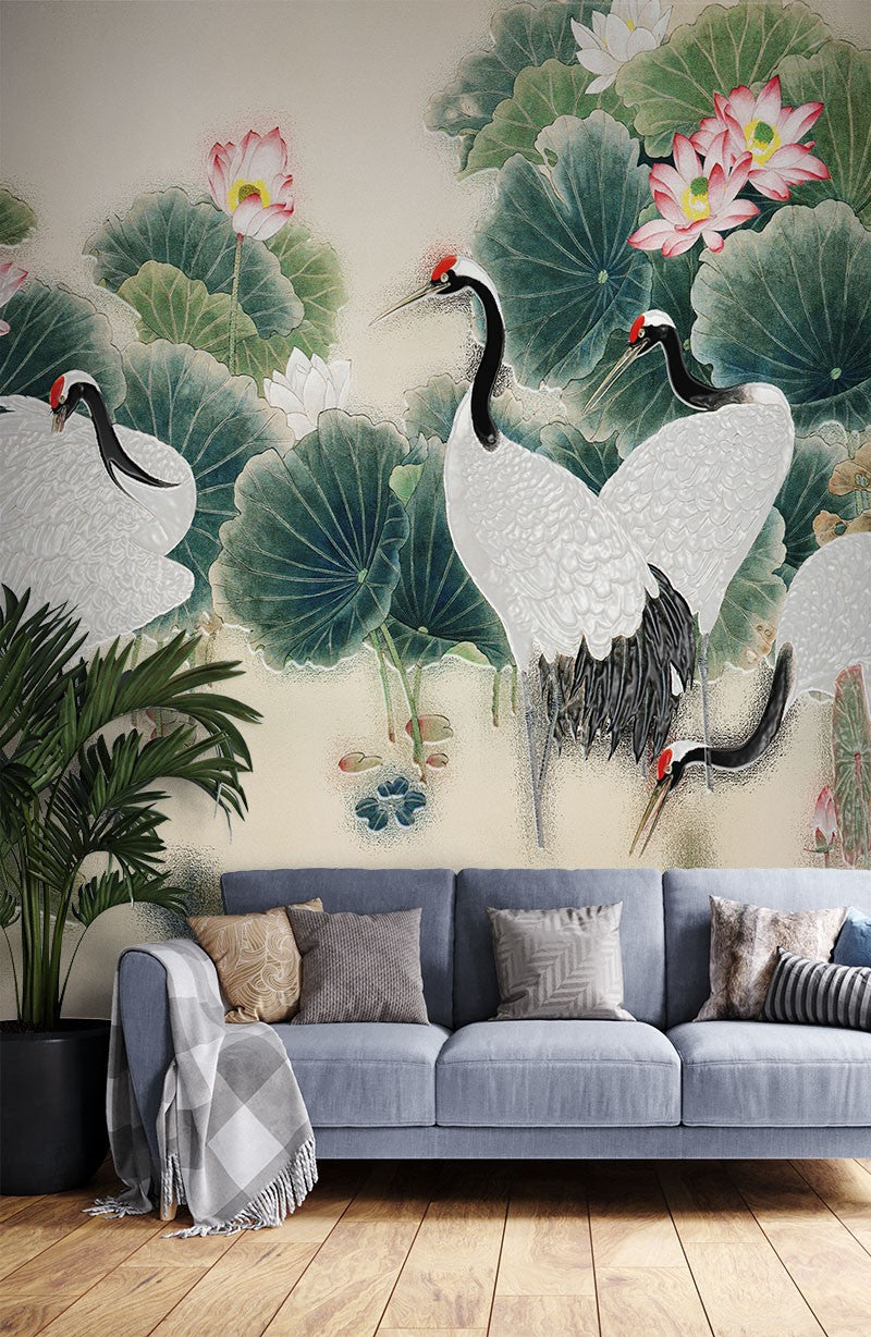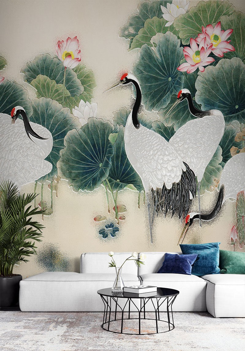 Cranes Painting Art Chinoiserie Creamy Wallpaper Mural