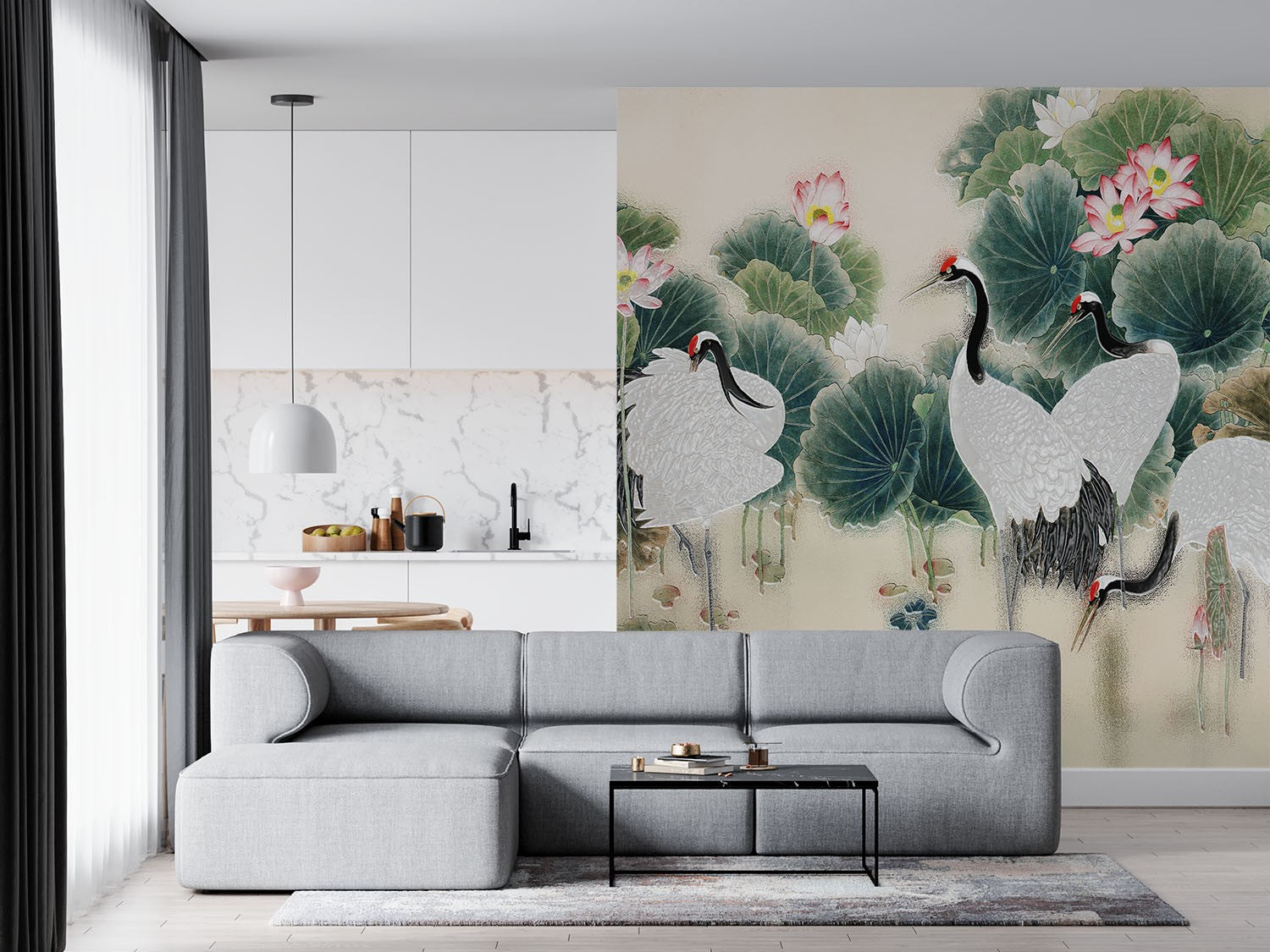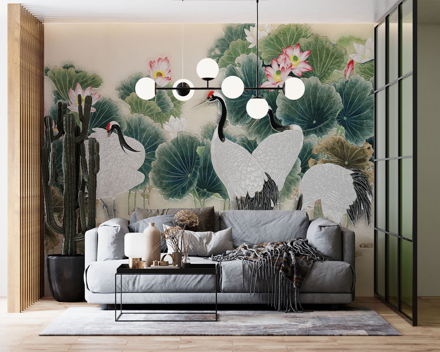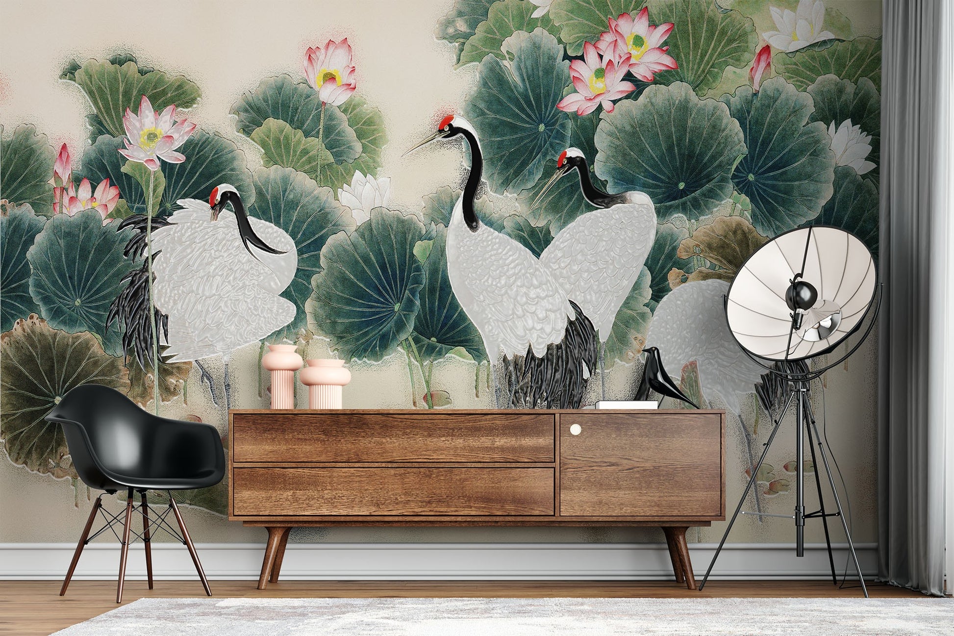 Cranes Painting Art Chinoiserie Creamy Wallpaper Mural