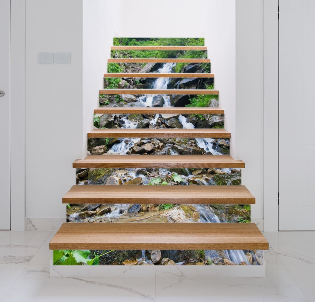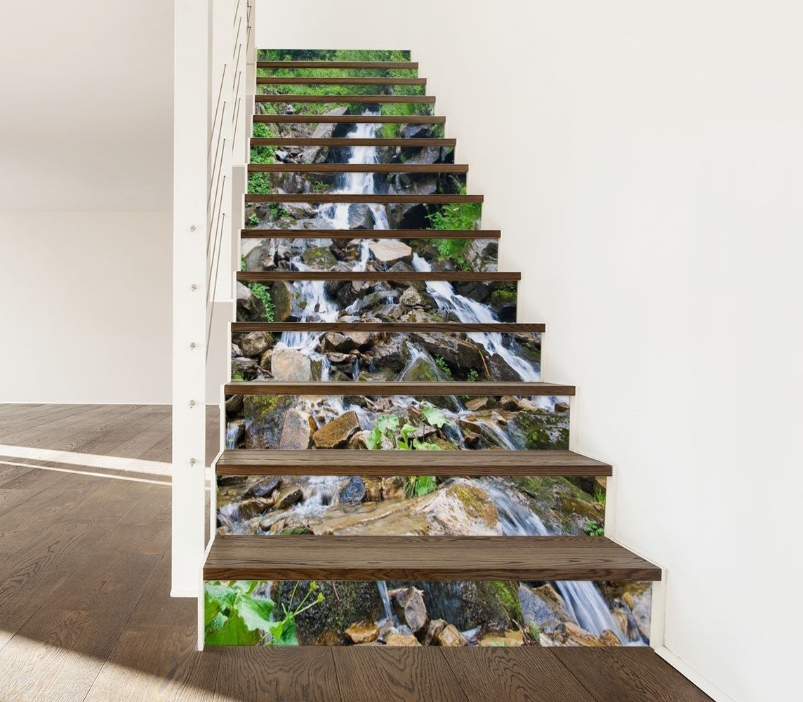 Creek Canyon Nature Waterfall Green Stair Riser Decals, Waterproof Removable Staircase Decals, Vinyl Peel And Stick Stairs Decal Stickers