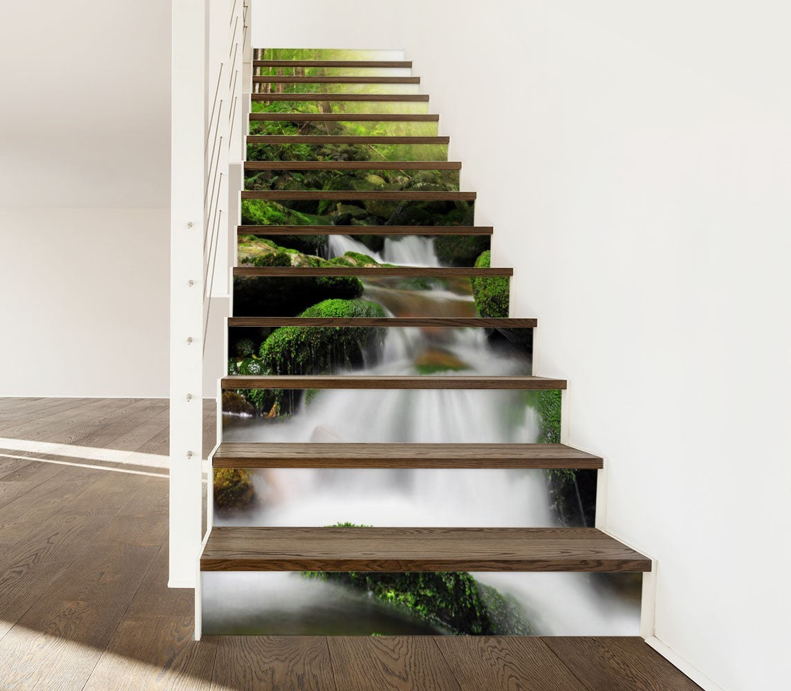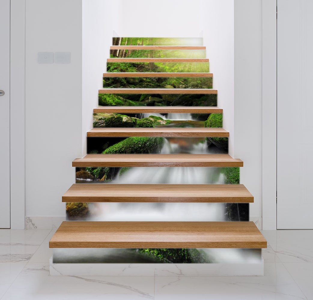 Creek Waterfall Nature Green Stair Riser Decals, Waterproof Removable Staircase Decals, Vinyl Peel And Stick Stairs Decal Stickers