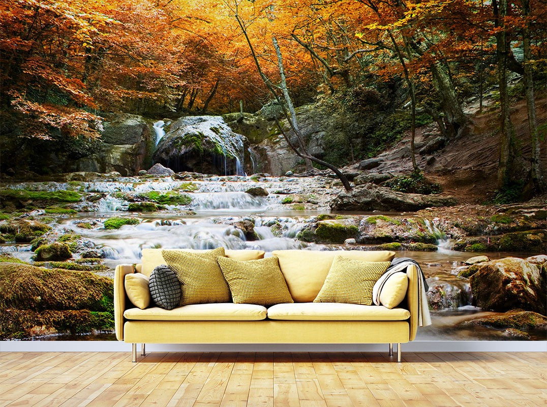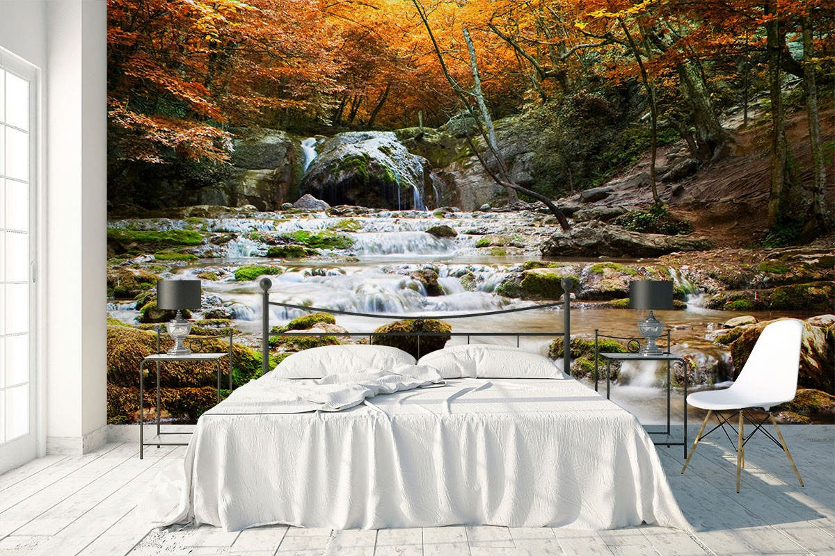 Creek Waterfall Nature Orange Wallpaper Mural,Self-Adhesive Peel And Stick 3D Wall Paper,Designer Removable Wall Decor