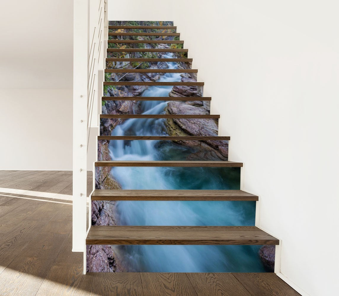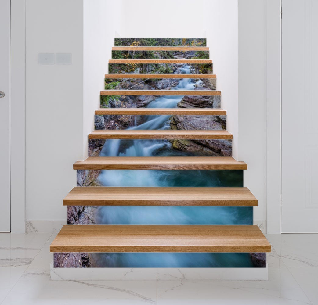Creek Waterfall Nature Rivers Green Stair Riser Decals, Waterproof Removable Staircase Decals, Vinyl Peel And Stick Stairs Decal Stickers