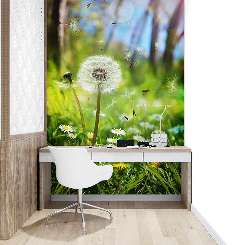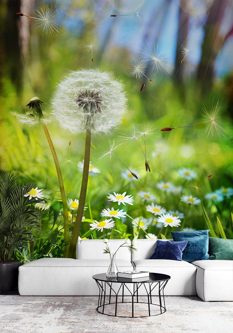 Dandelion Meadow Floral Dutch Flowers Green Wallpaper Mural,Self-Adhesive Peel And Stick 3D Wall Decal,Removable Bedroom Wall Decor