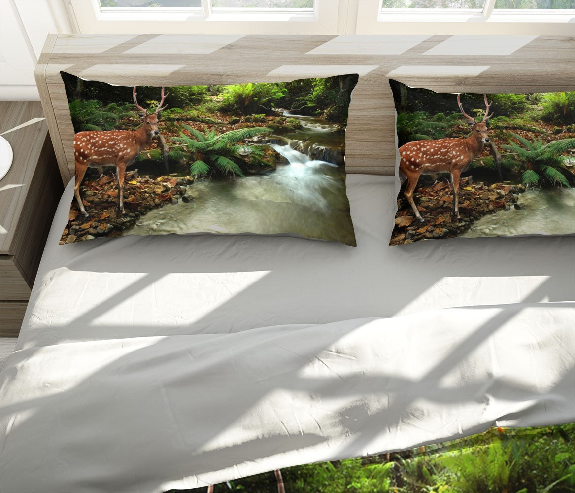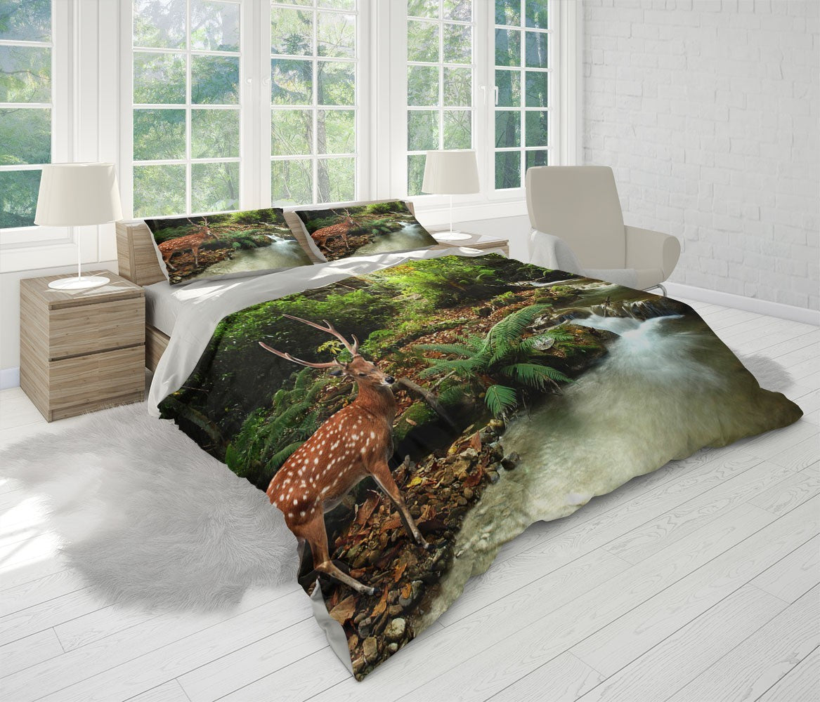 Deer Creek Duvet Cover Set W Pillow Cover, Green Animals Wild Animals 3D Quilt Cover, Single Double Queen King Size Doona Cover
