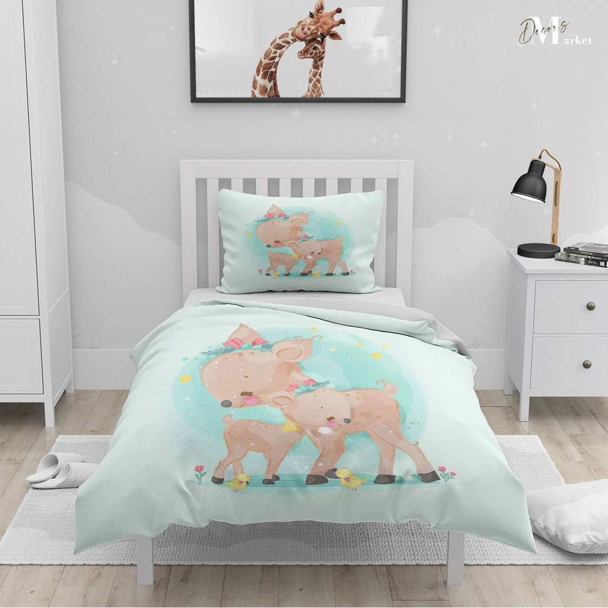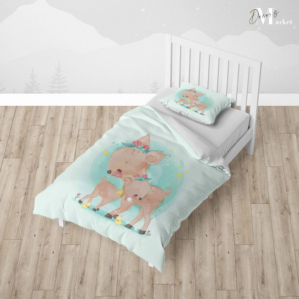 Deer Family Duvet Cover Set w Pillow Cover, Green Kids Cartoon 3D Quilt Cover, Single Double Queen King Size Doona Cover