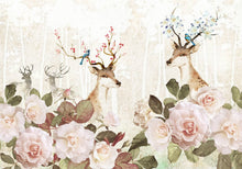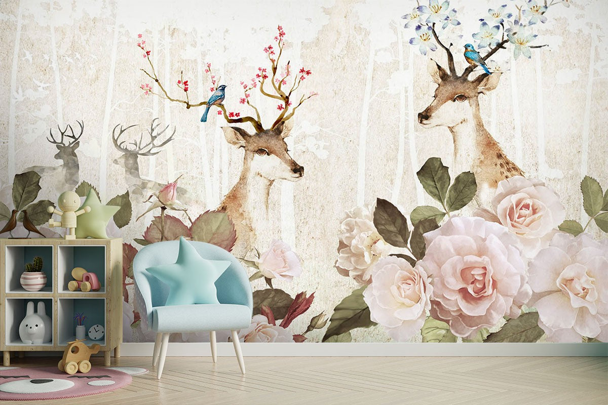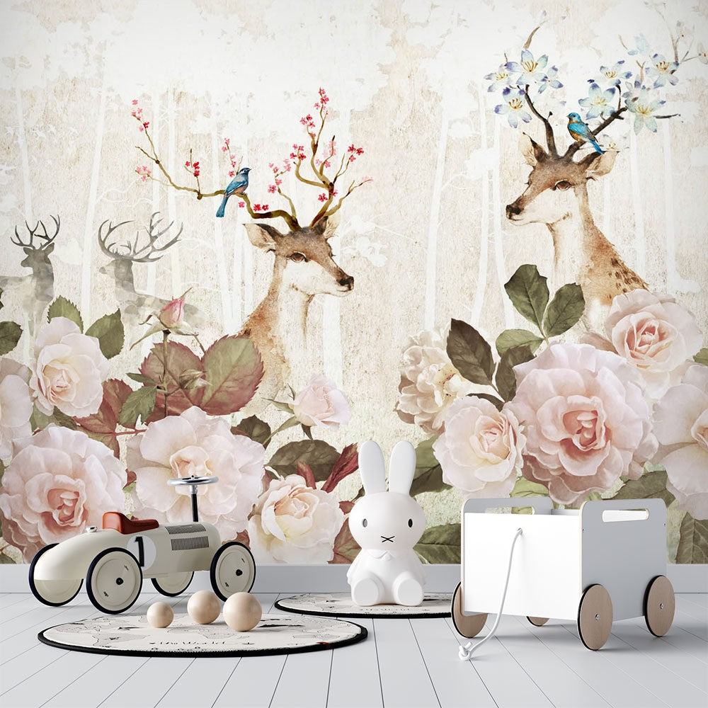 Deer Flowers Art Chinoiserie Beige Wallpaper Mural