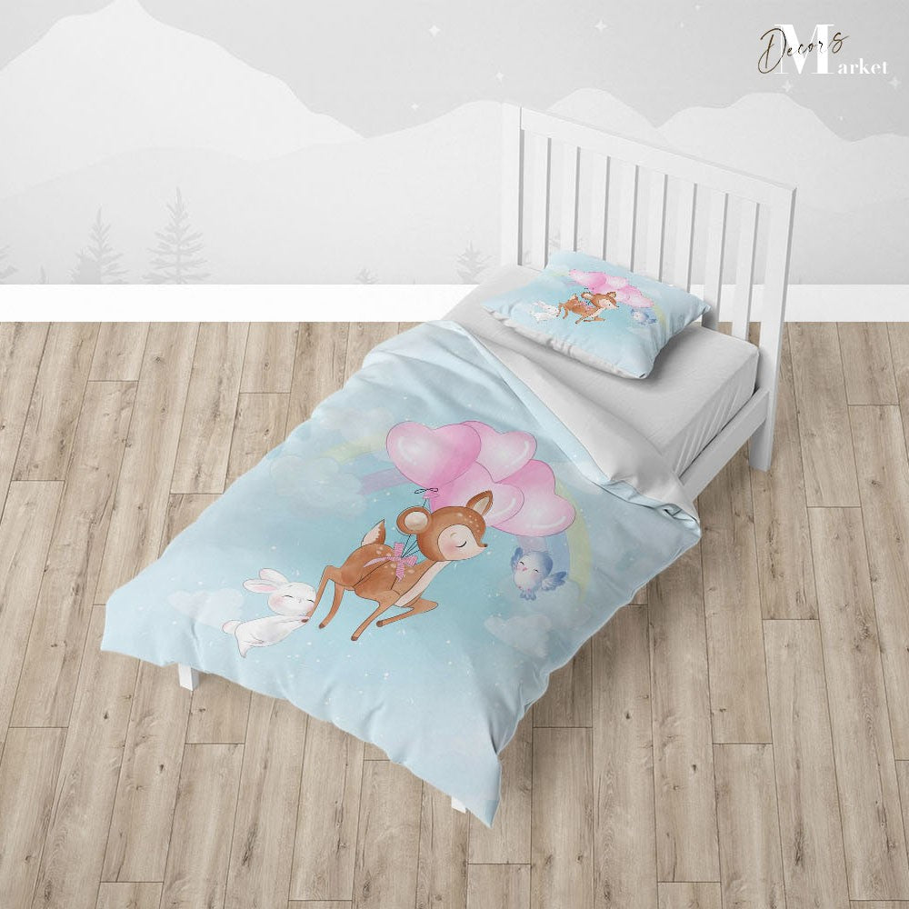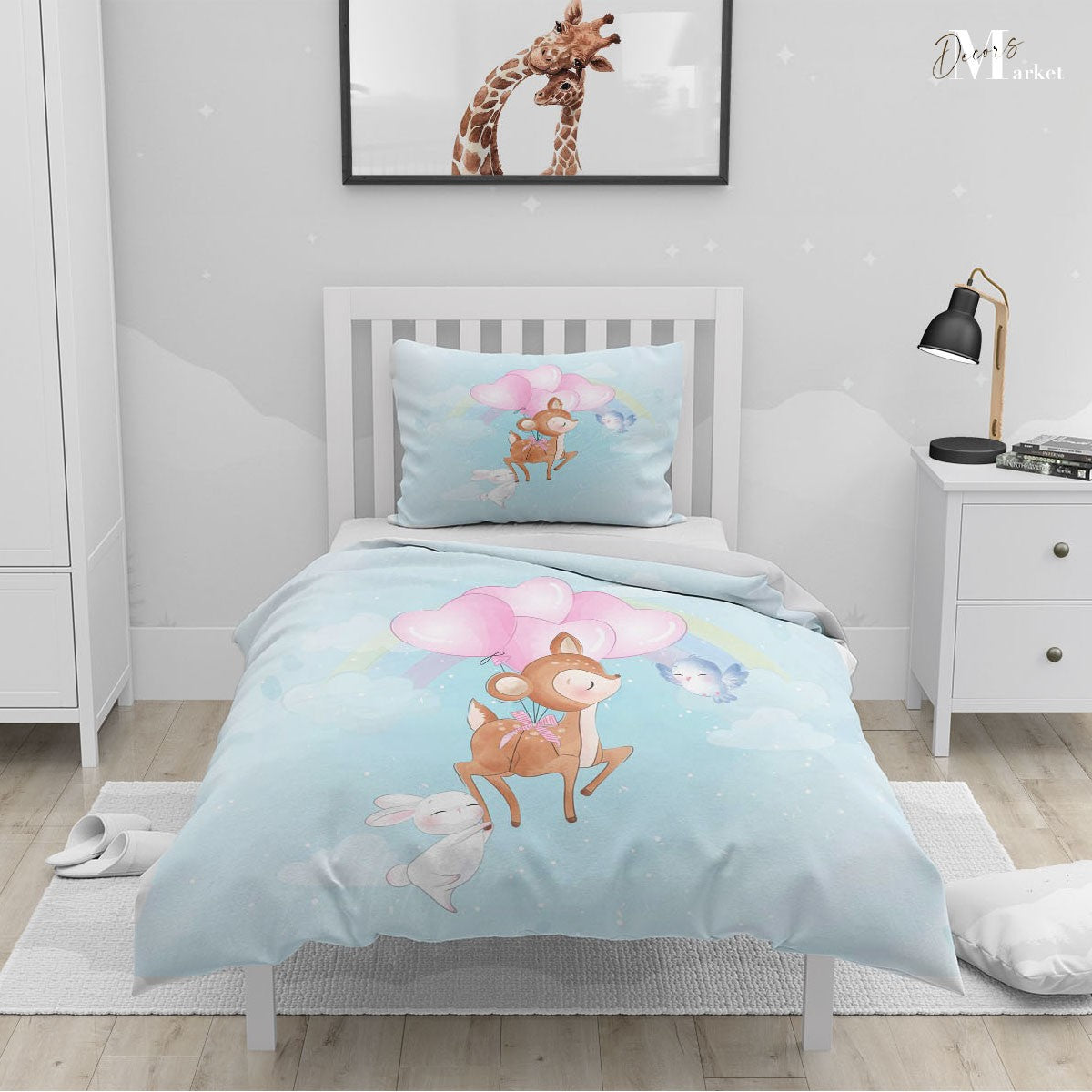 Deer Fly Balloon Duvet Cover Set w Pillow Cover, Brown Kids Cartoon 3D Quilt Cover, Single Double Queen King Size Doona Cover