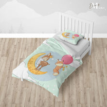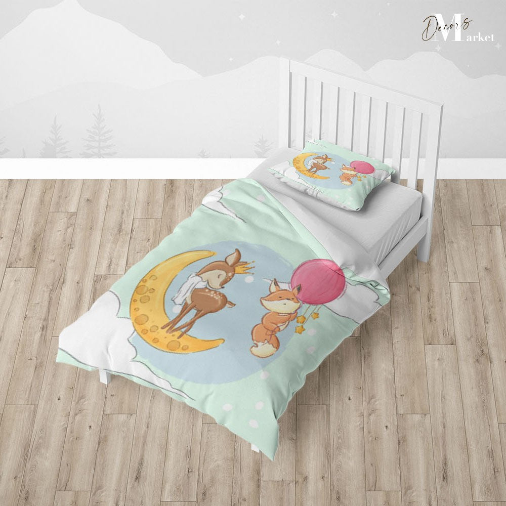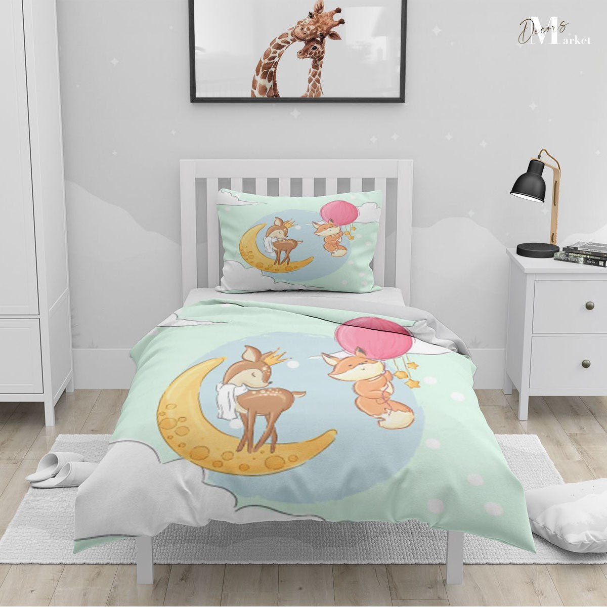 Deer Fox Moon Duvet Cover Set w Pillow Cover, Yellow Art Watercolor 3D Quilt Cover, Single Double Queen King Size Doona Cover