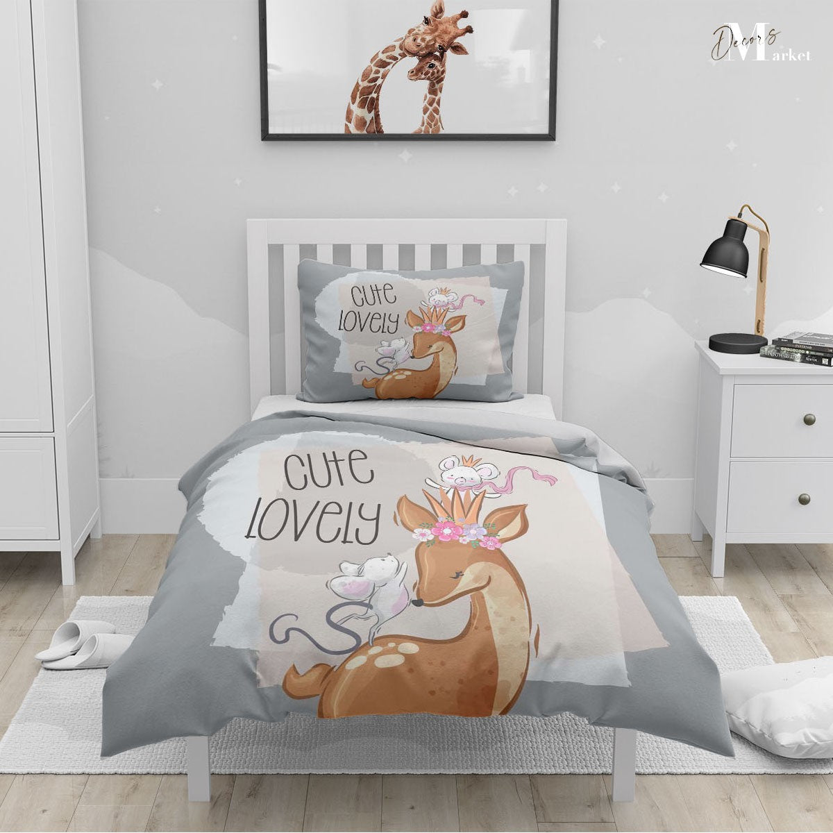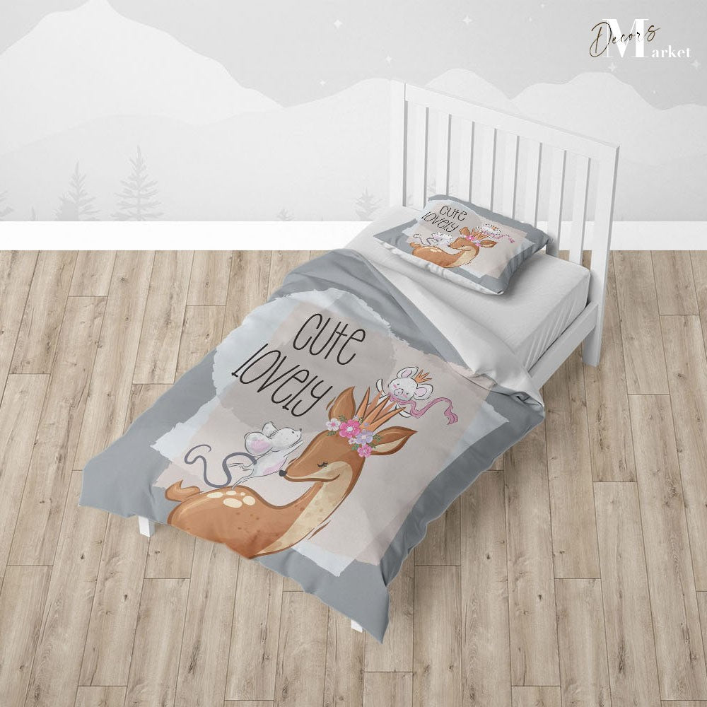 Deer Mouse Cute Duvet Cover Set w Pillow Cover, Gray Kids Cartoon 3D Quilt Cover, Single Double Queen King Size Doona Cover