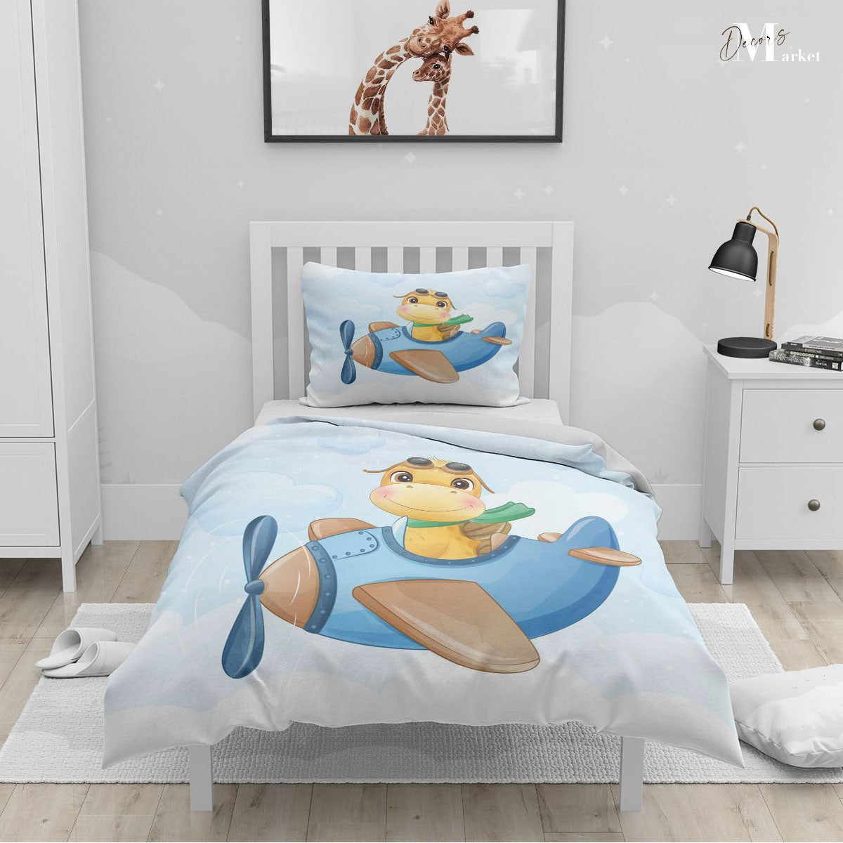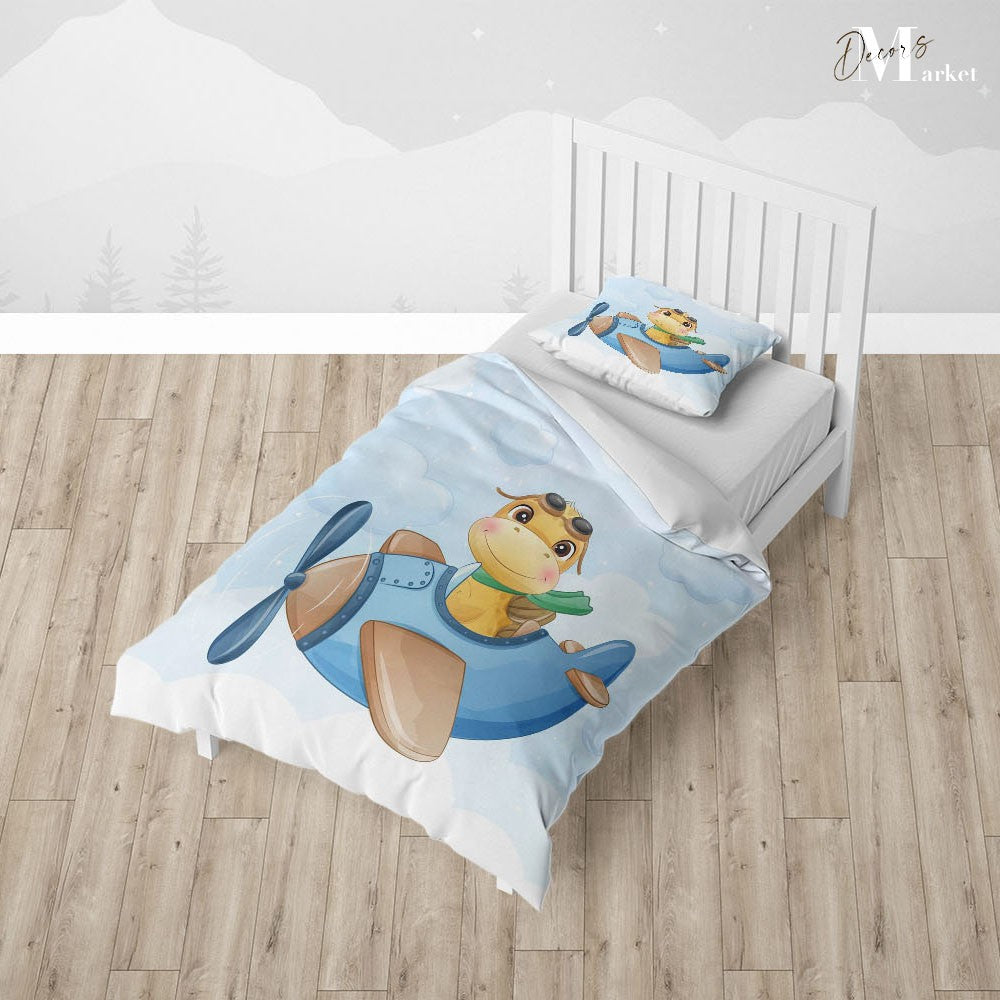 Dinosaur Plane Pilot Duvet Cover Set w Pillow Cover, Blue Kids Cartoon 3D Quilt Cover, Single Double Queen King Size Doona Cover
