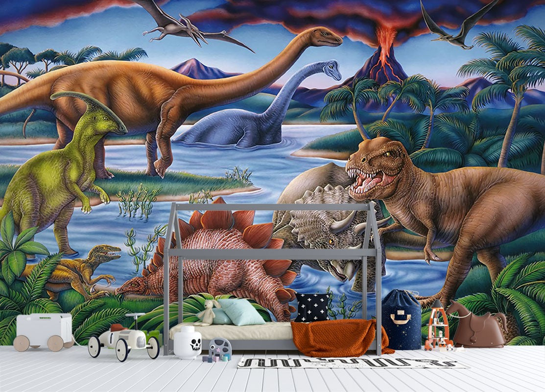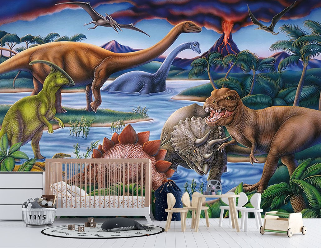 Dinosaurs Kids Green Wallpaper Mural,Self-Adhesive Peel And Stick 3D Wall Art,Bedroom Designer Wall Decor