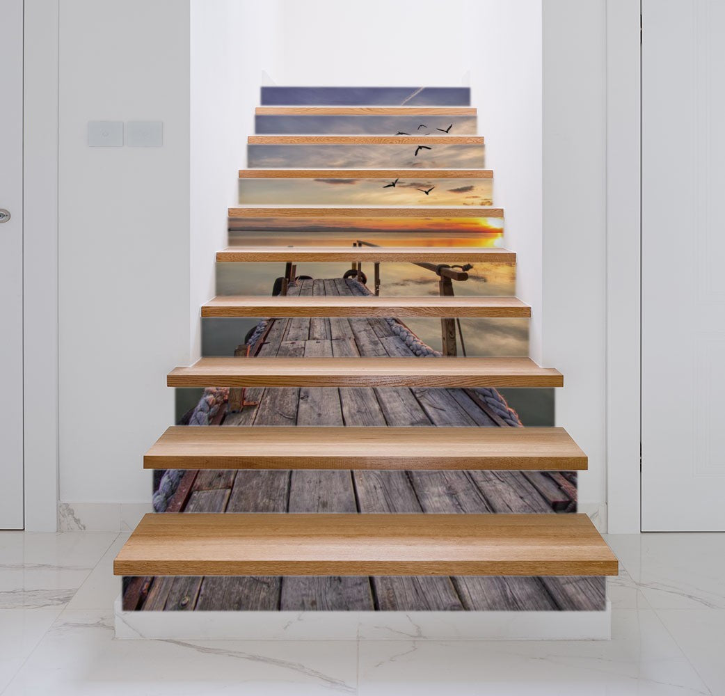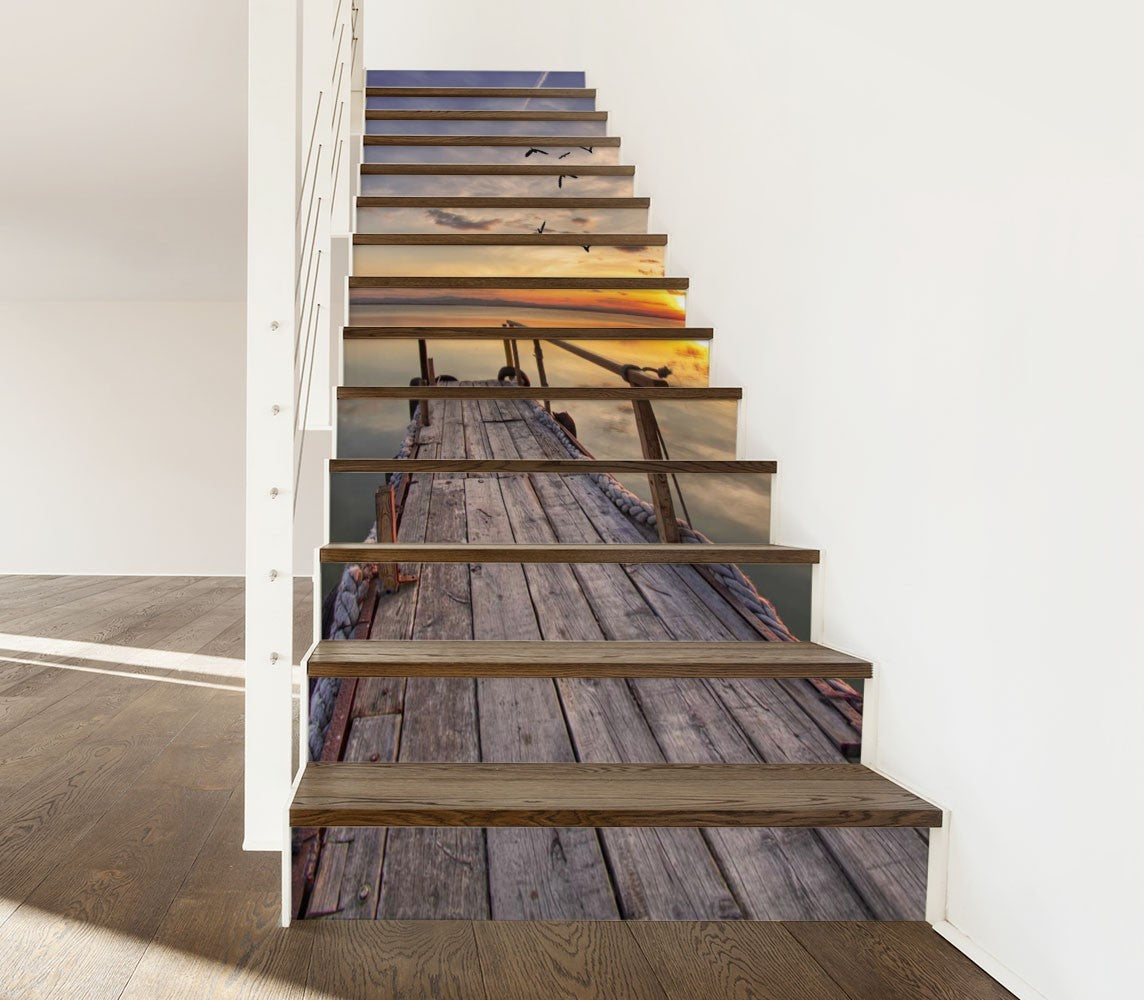 Dock Sun Beach Sunrise Sunset Brown Stair Riser Decals, Waterproof Removable Staircase Decals, Vinyl Peel And Stick Stairs Decal Stickers