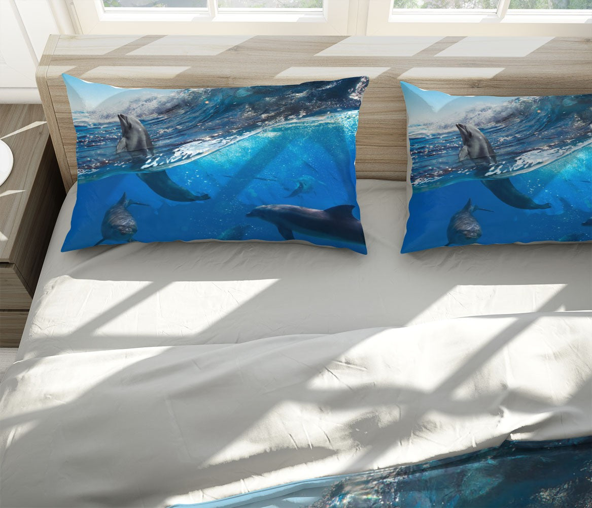 Dolphins Animals Sea Life Blue 3D Duvet Cover Set W Pillow Cover, Single Double Queen King Size, Printed Cotton Quilt Doona Cover 3 Pcs