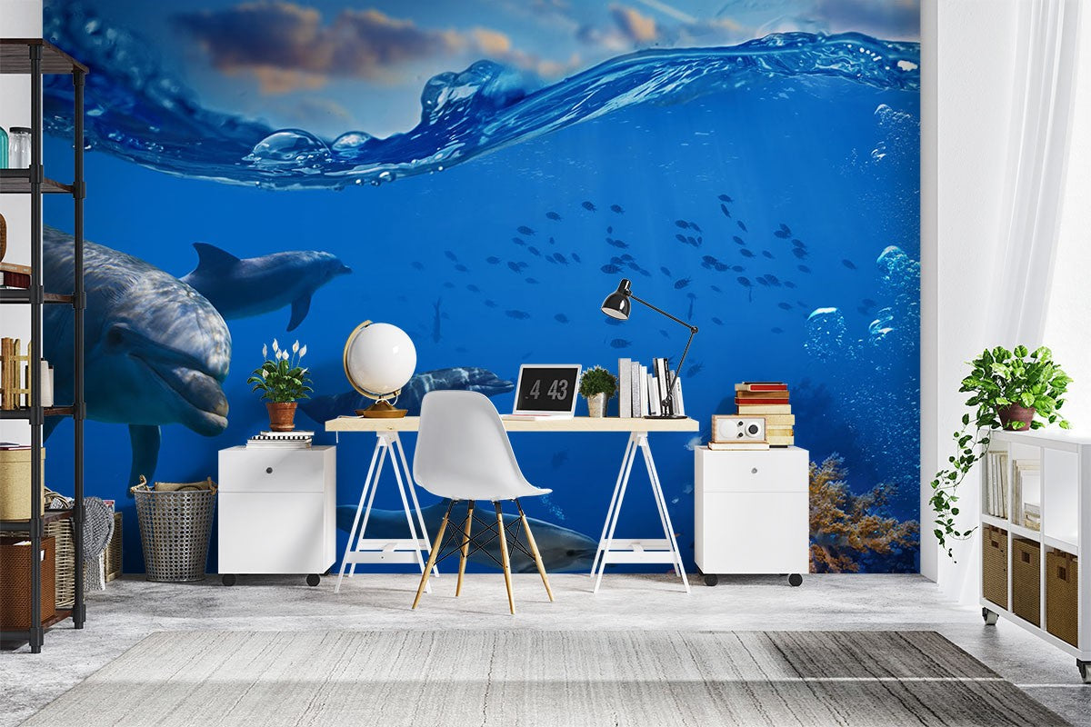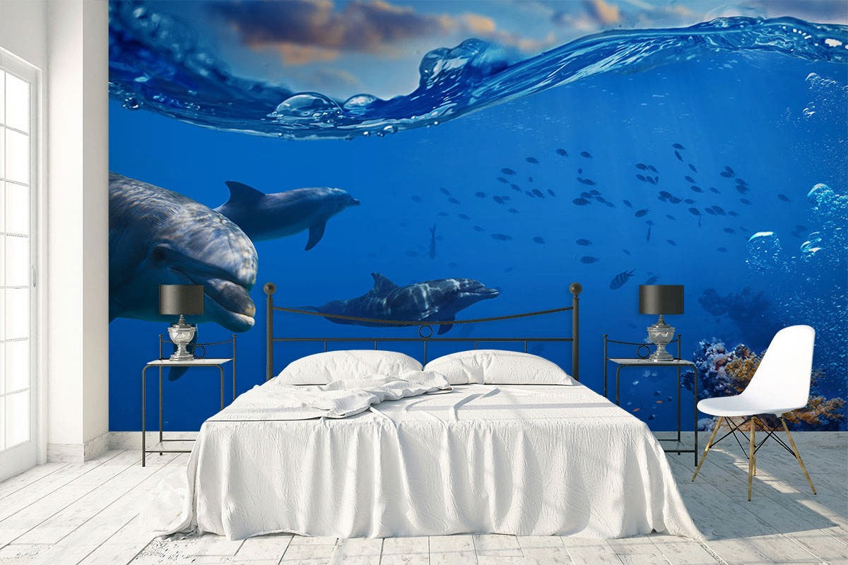Dolphin Animals Sea Life Blue Wallpaper Mural,Self-Adhesive Peel And Stick 3D Wall Art,Designer Removable Wall Decor
