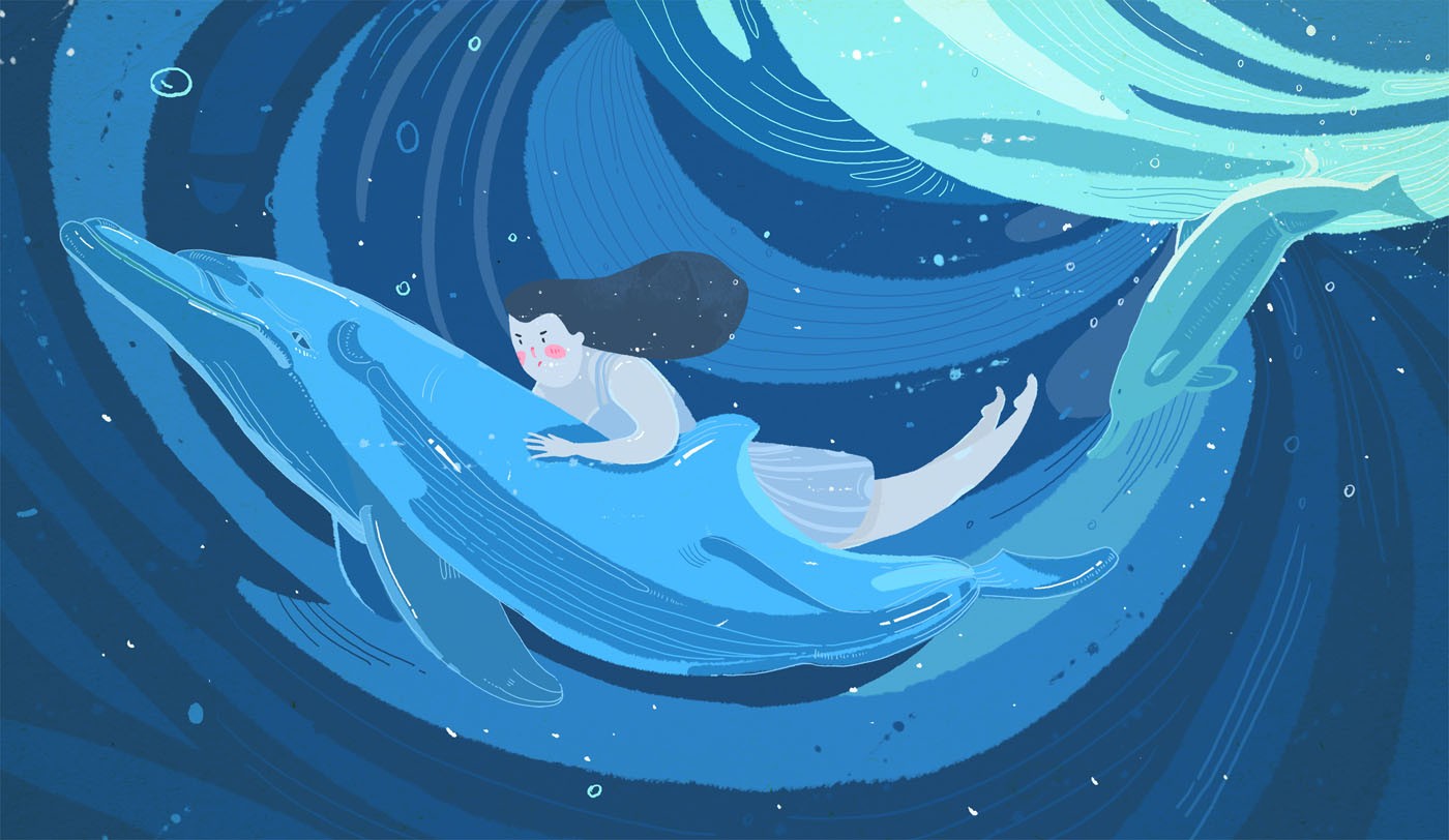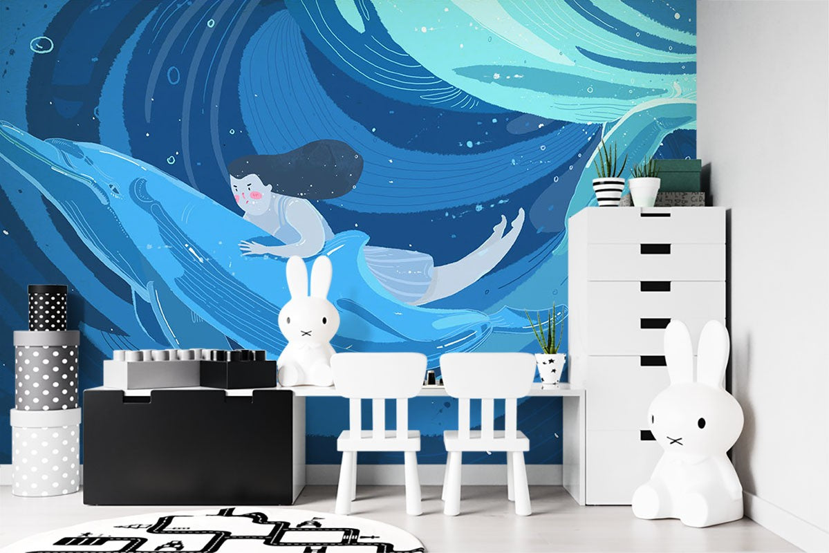 Dolphin Girl Kids Fantasy Blue Wallpaper Mural,Self-Adhesive Peel And Stick 3D Wall Mural,Removable Bedroom Wall Decor