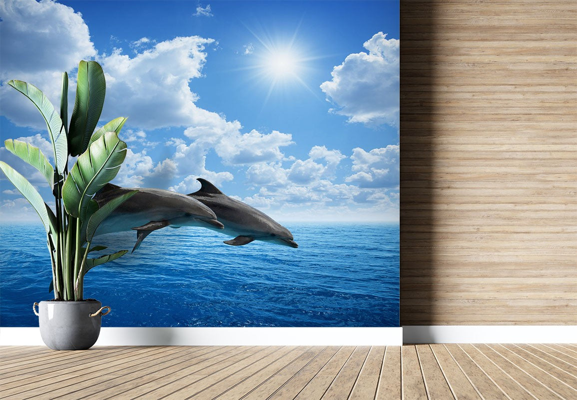 Dolphin Surfing Animals Sea Life Blue Wallpaper Mural,Self-Adhesive Peel And Stick 3D Wall Mural,Designer Bedroom Wall Decor
