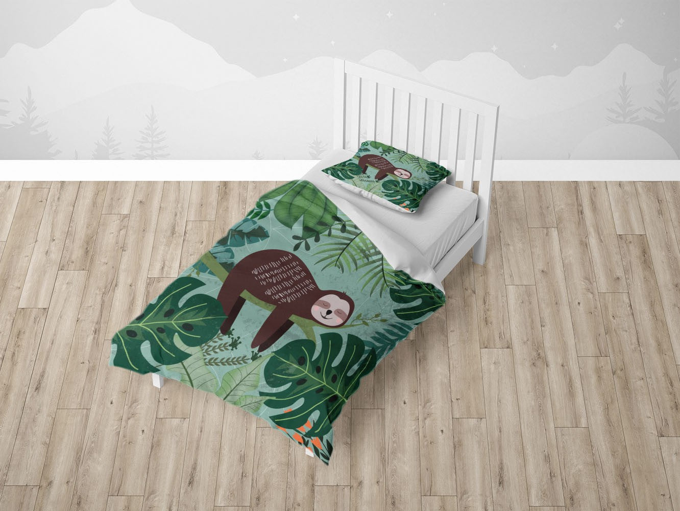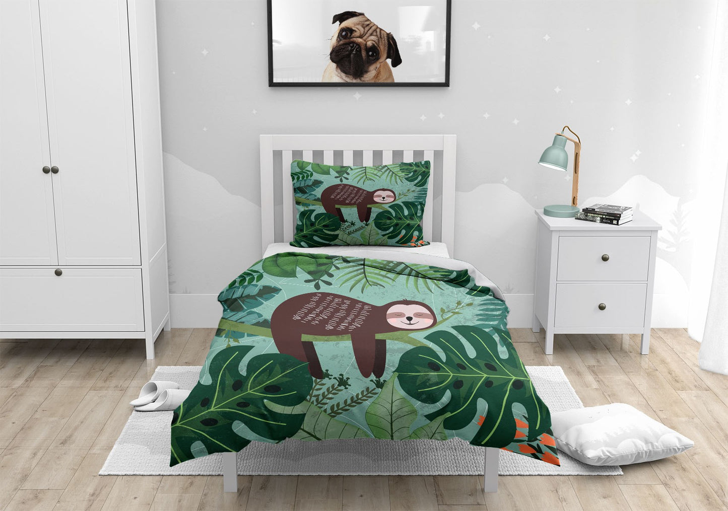 Dream Jungle Sloth Duvet Cover Set w Pillowcases, Green Kids Cartoon 3D Quilt Cover, 3pc Single Double Queen King Size Doona Cover