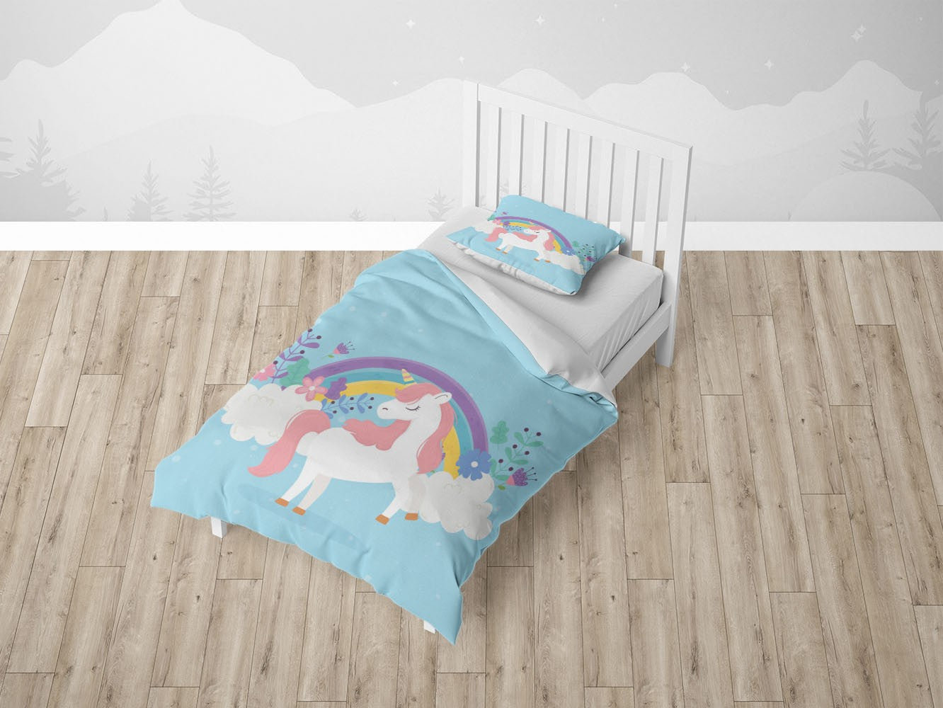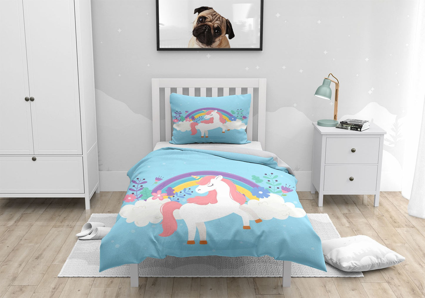 Dream Rainbow Unicorn Duvet Cover Set w Pillowcases, Blue Kids Cartoon 3D Quilt Cover, 3pc Single Double Queen King Size Doona Cover