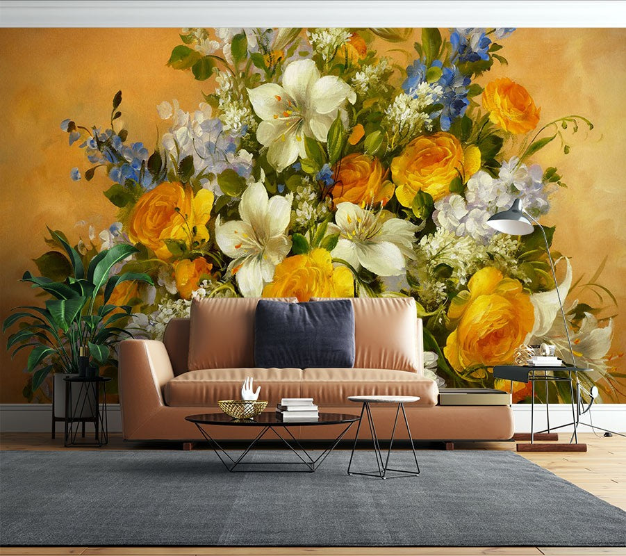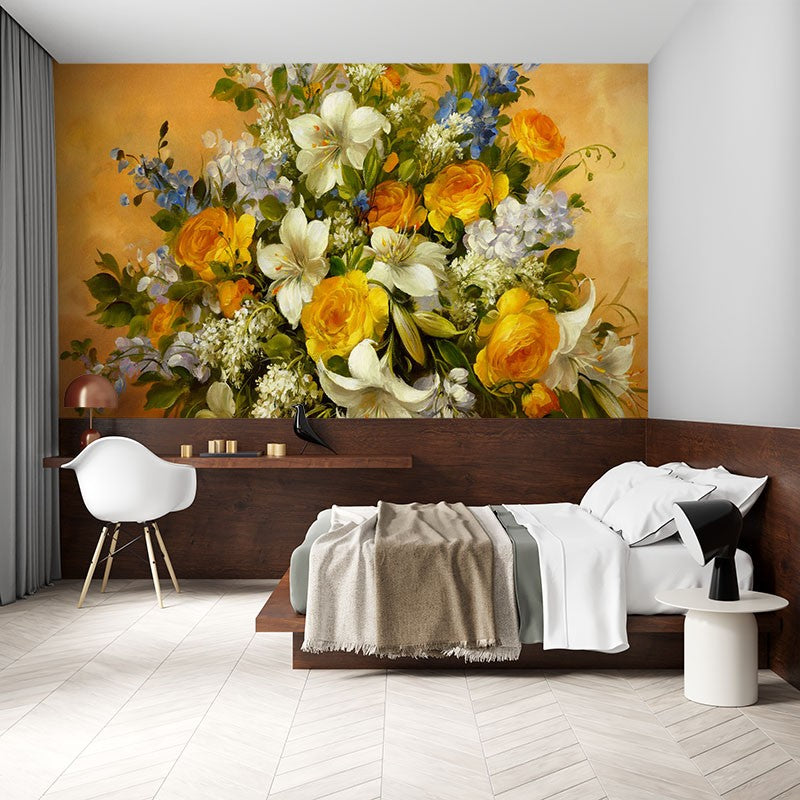 Dutch Flower Arrangement Art Gold Wallpaper Mural,Self-Adhesive Peel And Stick 3D Wall Decor,Bedroom Designer Wall Decor