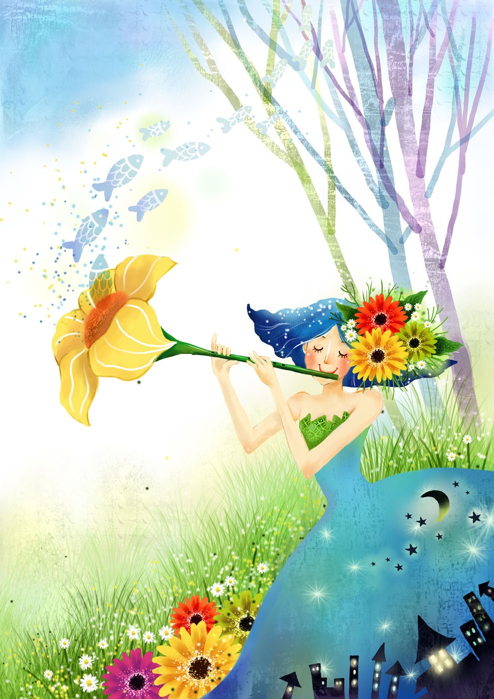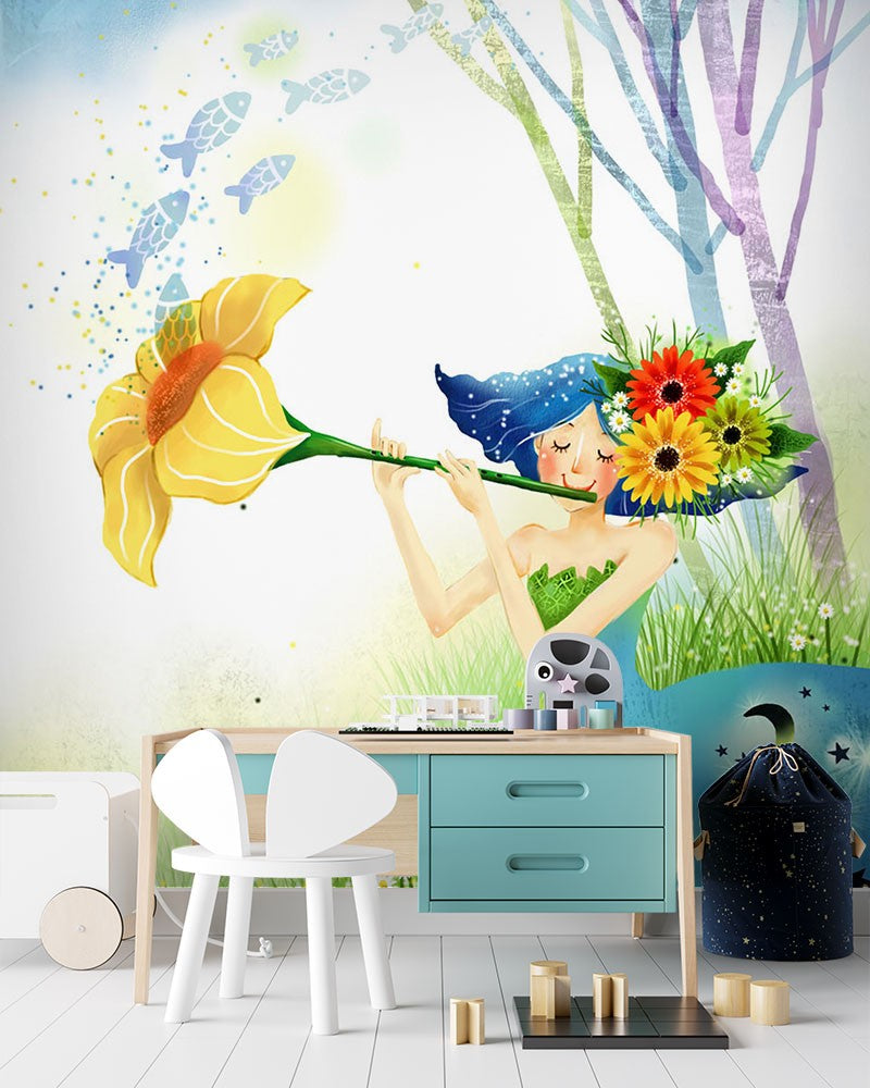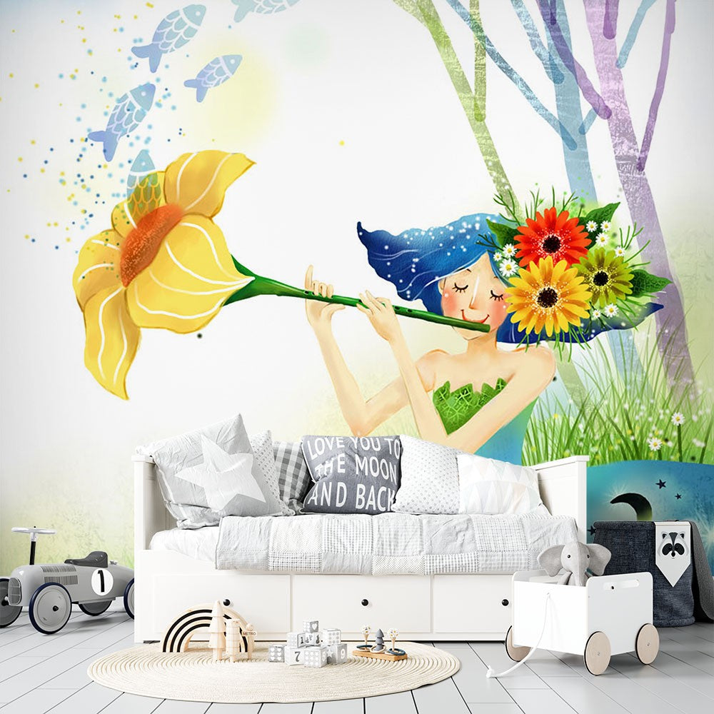 Dutch Flower Fairy Kids Fantasy Green Wallpaper Mural,Self-Adhesive Peel And Stick 3D Wall Paper,Bedroom Designer Wall Decor