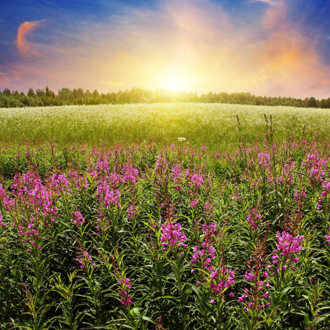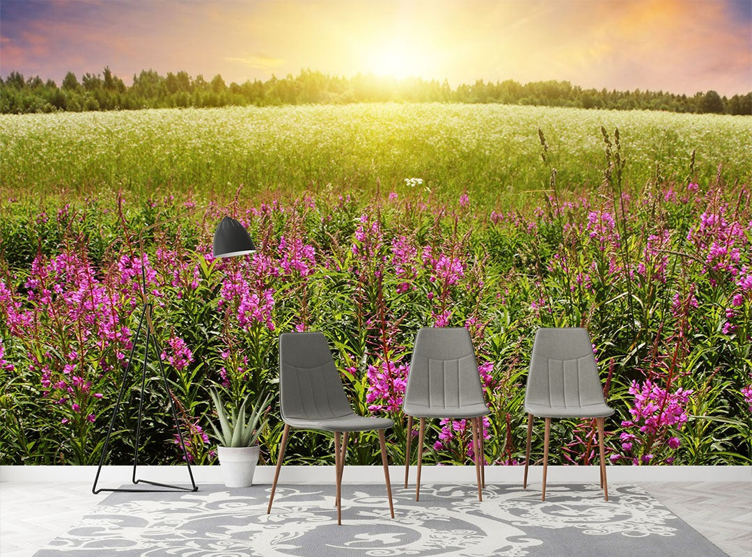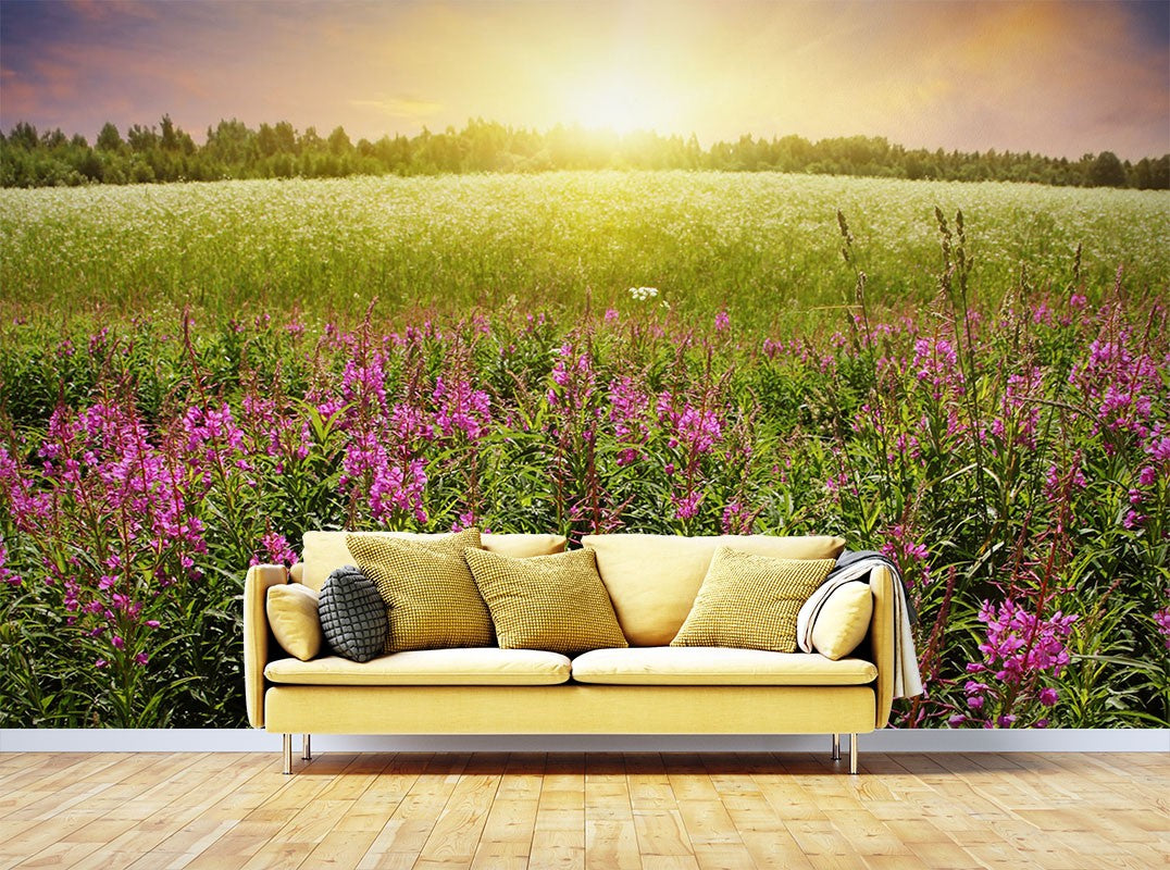 Flower Field Floral Flowers Garden Sunset Green Gold Wallpaper Mural,Self-Adhesive Peel And Stick 3D Wall Art,Designer Removable Wall Decor