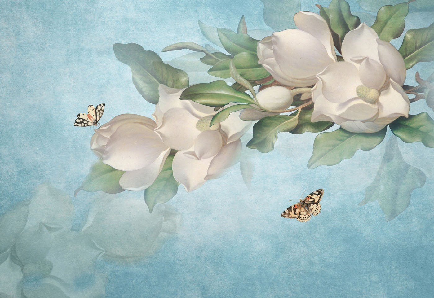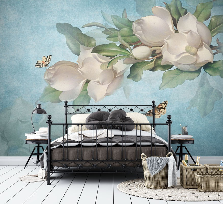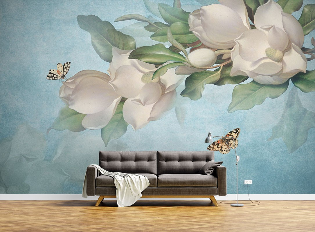 White Magnolia Flower Floral Blue Wallpaper Mural, Self-Adhesive Peel And Stick 3D Wall Decal, Bedroom Removable Wall Decor