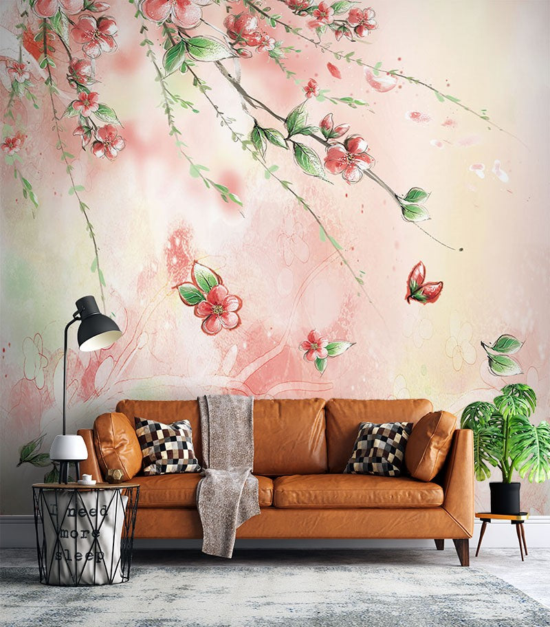 Dutch Flowers Art Watercolor Pink Wallpaper Mural,Self-Adhesive Peel And Stick 3D Wall Mural,Designer Bedroom Wall Decor
