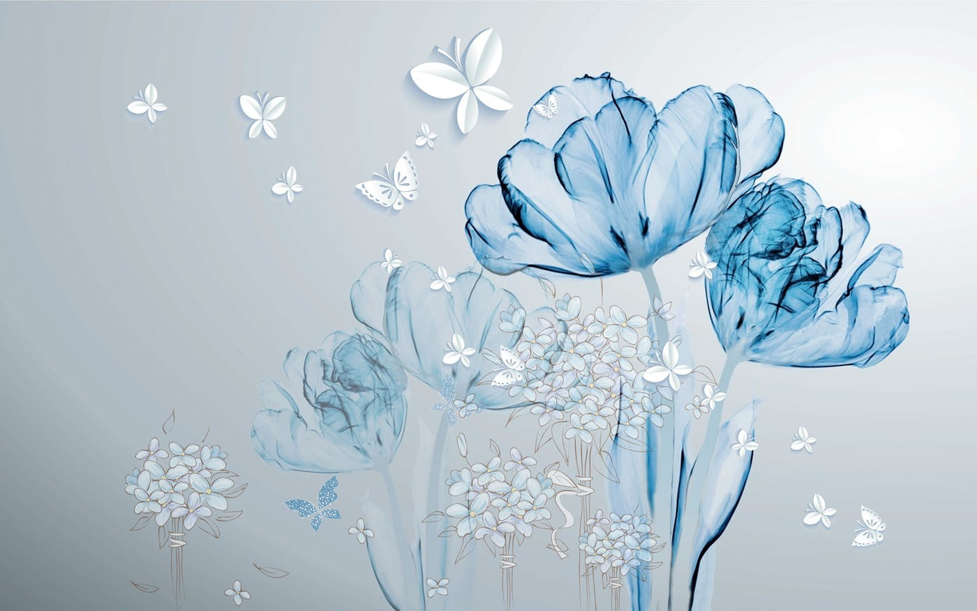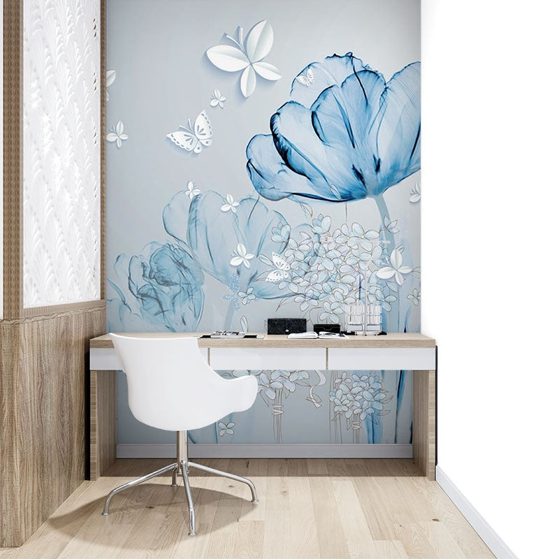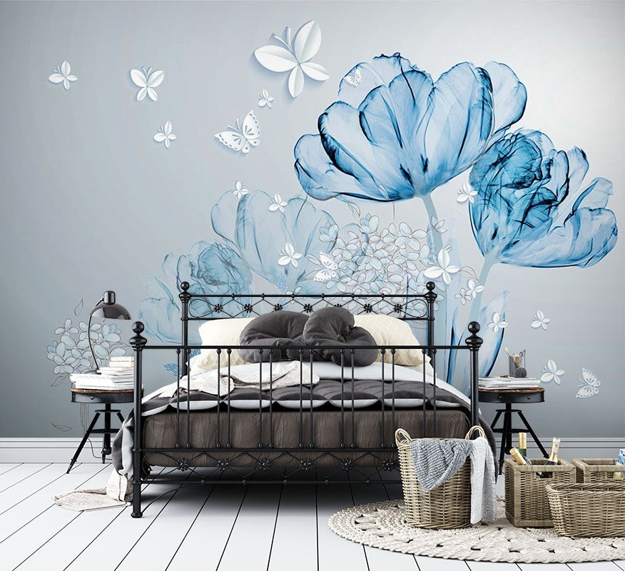 Dutch Flowers Butterflies Floral Blue Wallpaper Mural,Self-Adhesive Peel And Stick 3D Wall Art,Removable Bedroom Wall Decor