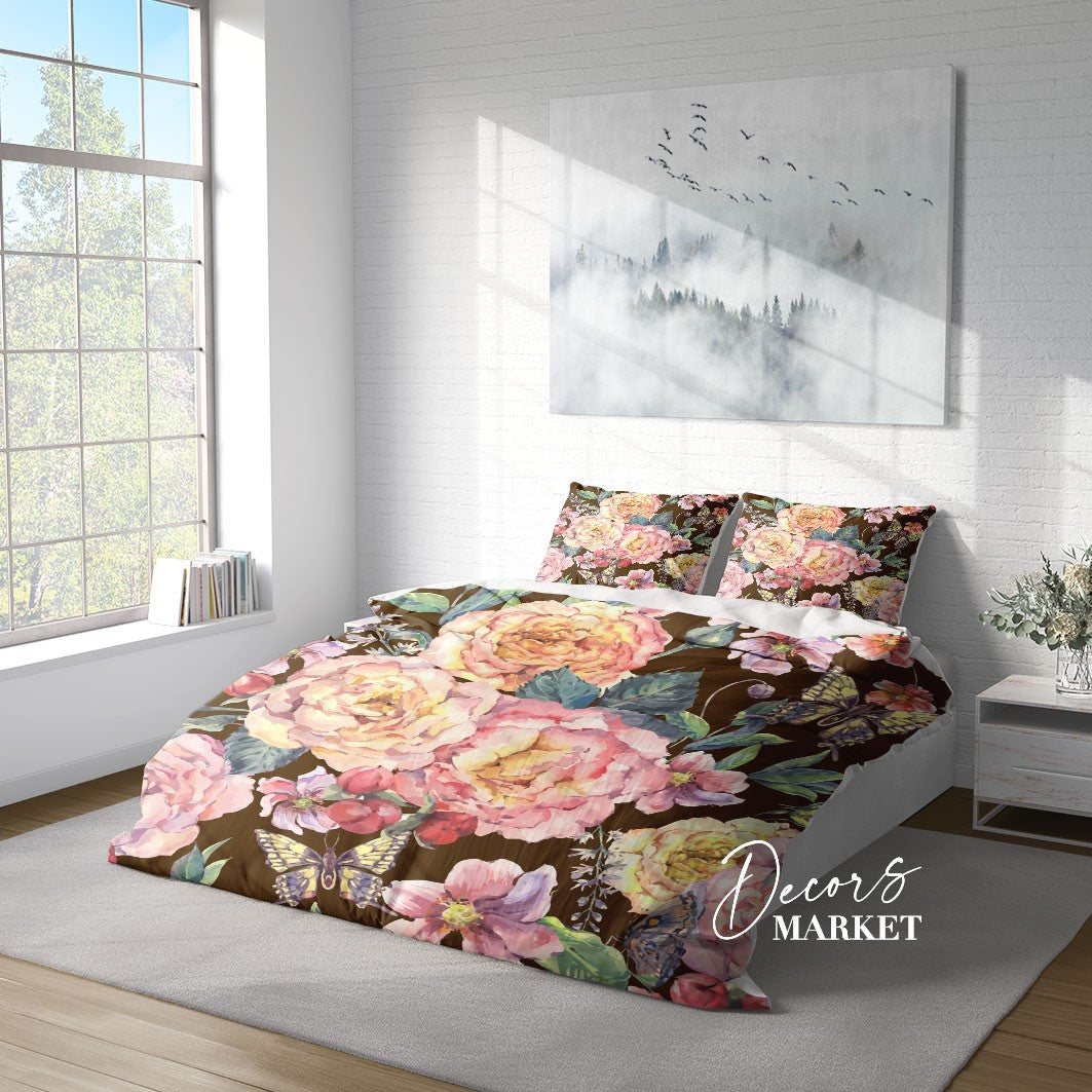 Dutch Garden Rose Duvet Cover Set w Pillowcases, Pink Floral Patterns 3D Quilt Cover, 3pc Single Double Queen King Size Doona Cover