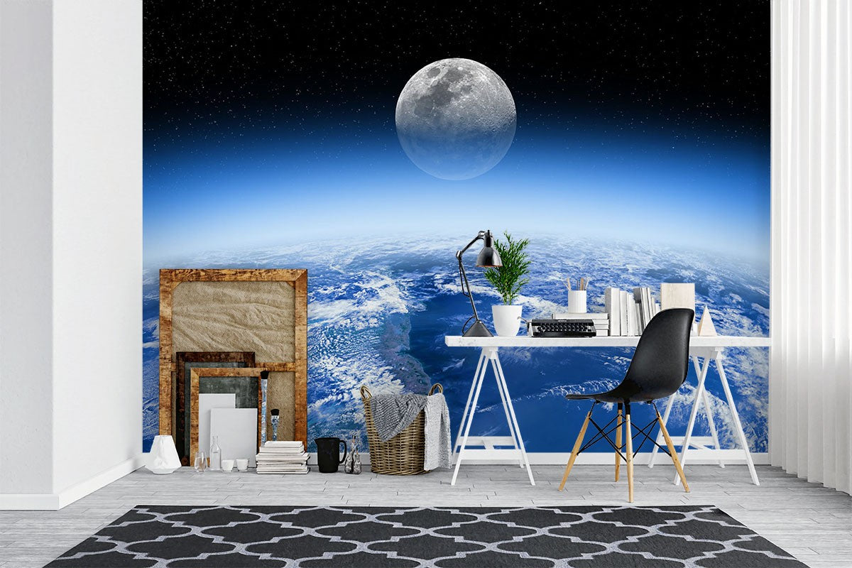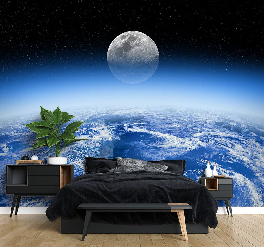 Earth Moon Nature Space Blue Wallpaper Mural,Self-Adhesive Peel And Stick 3D Wall Decal,Designer Australian Company Wall Decor