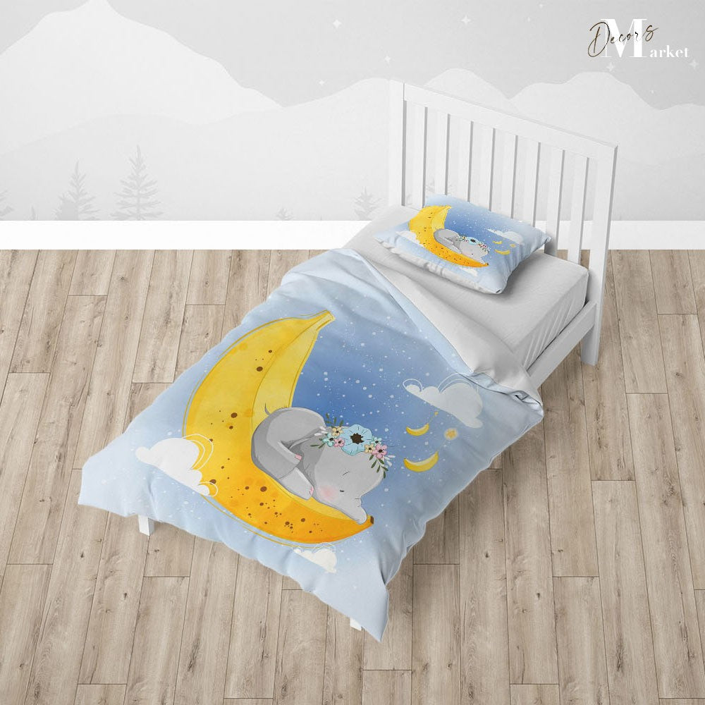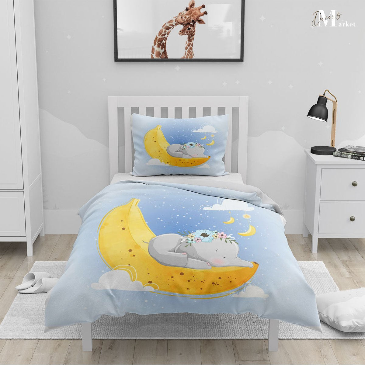 Elephant Banana Dream Duvet Cover Set w Pillow Cover, Blue Kids Cartoon 3D Quilt Cover, Single Double Queen King Size Doona Cover