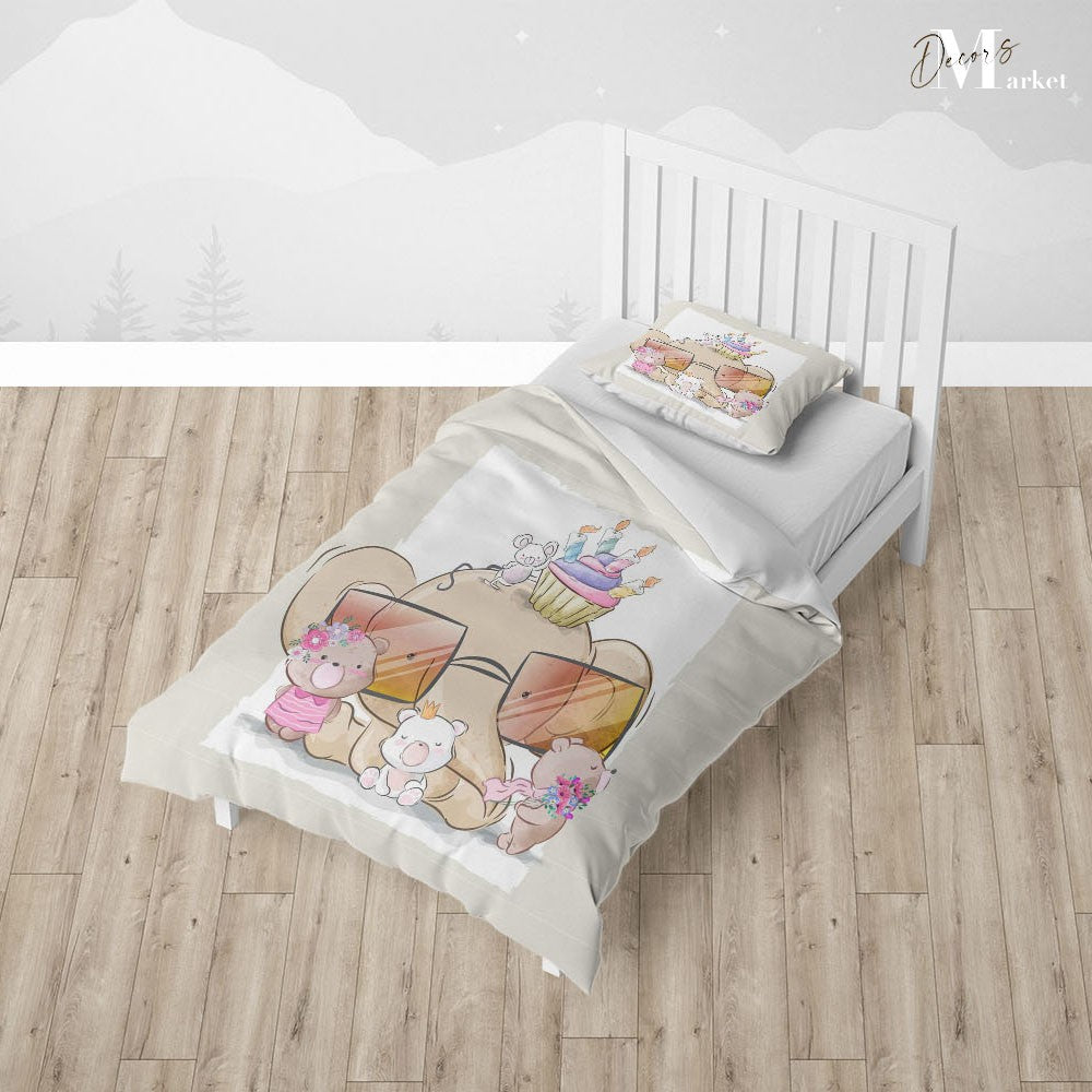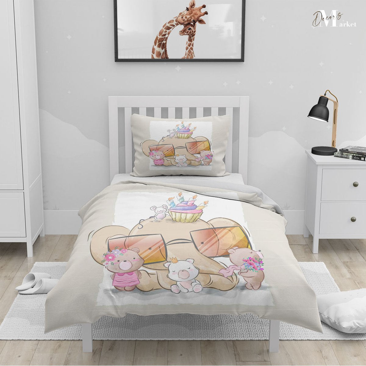 Elephant Bear Family Duvet Cover Set w Pillow Cover, Gray Kids Cartoon 3D Quilt Cover, Single Double Queen King Size Doona Cover