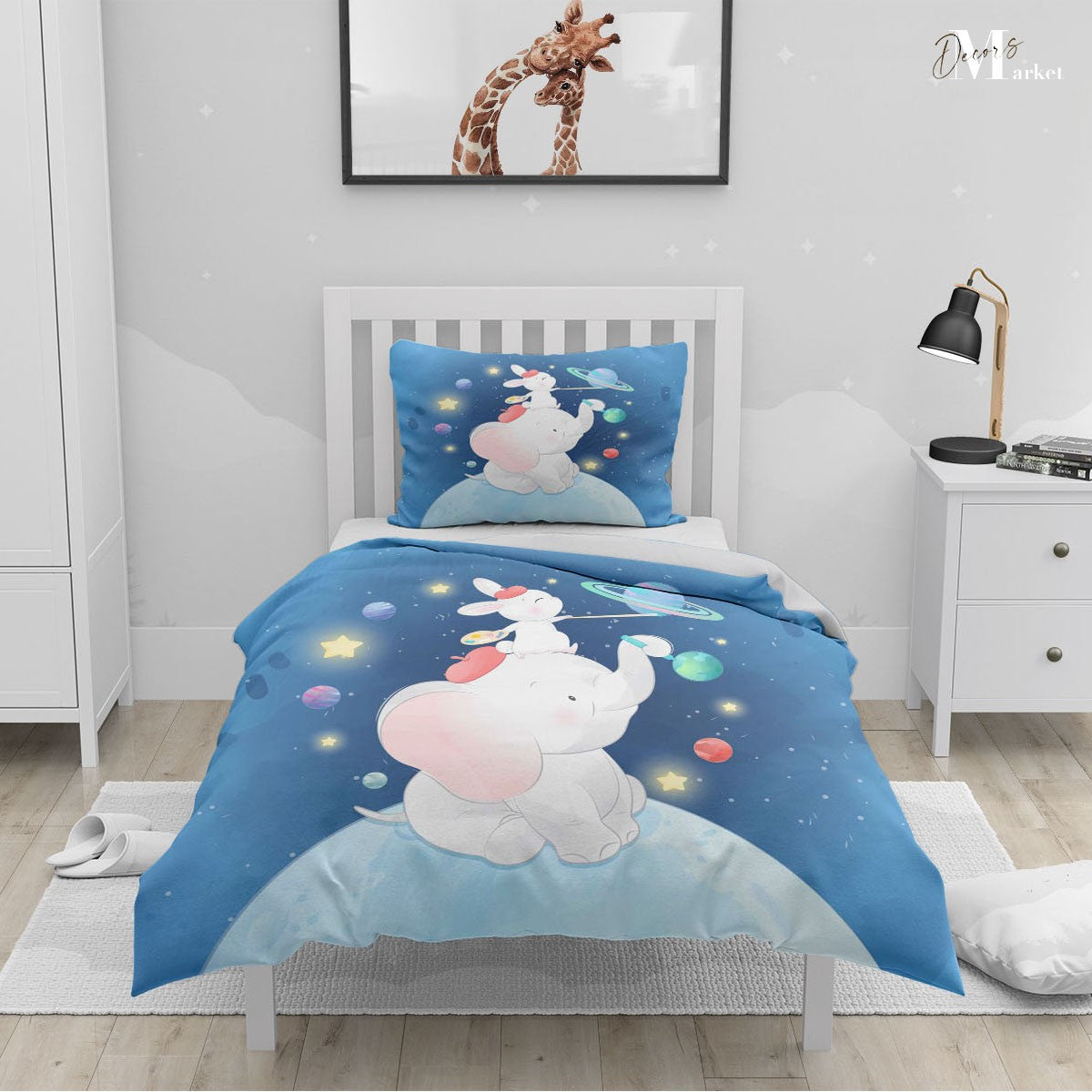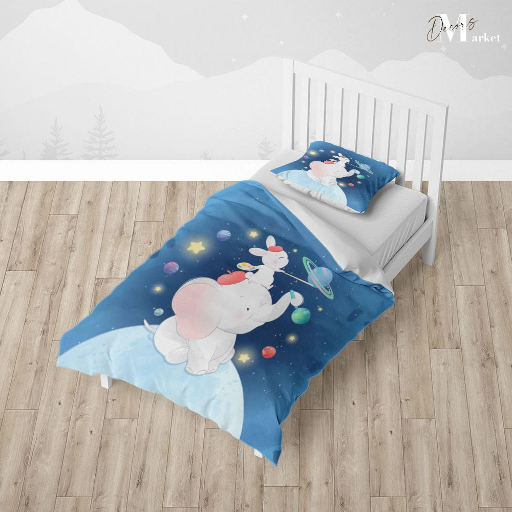 Elephant Space Earth Duvet Cover Set w Pillow Cover, Blue Kids Cartoon 3D Quilt Cover, Single Double Queen King Size Doona Cover