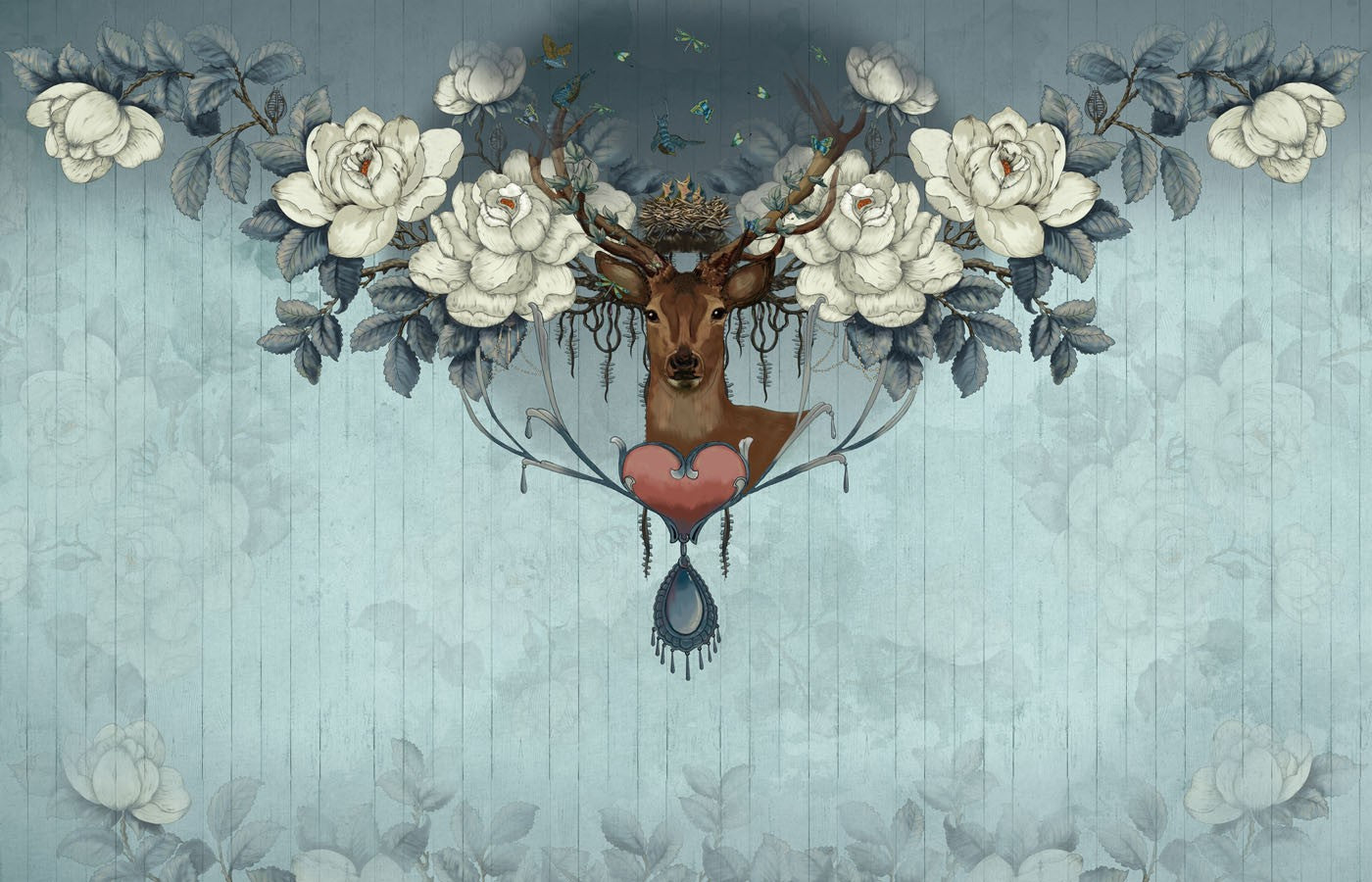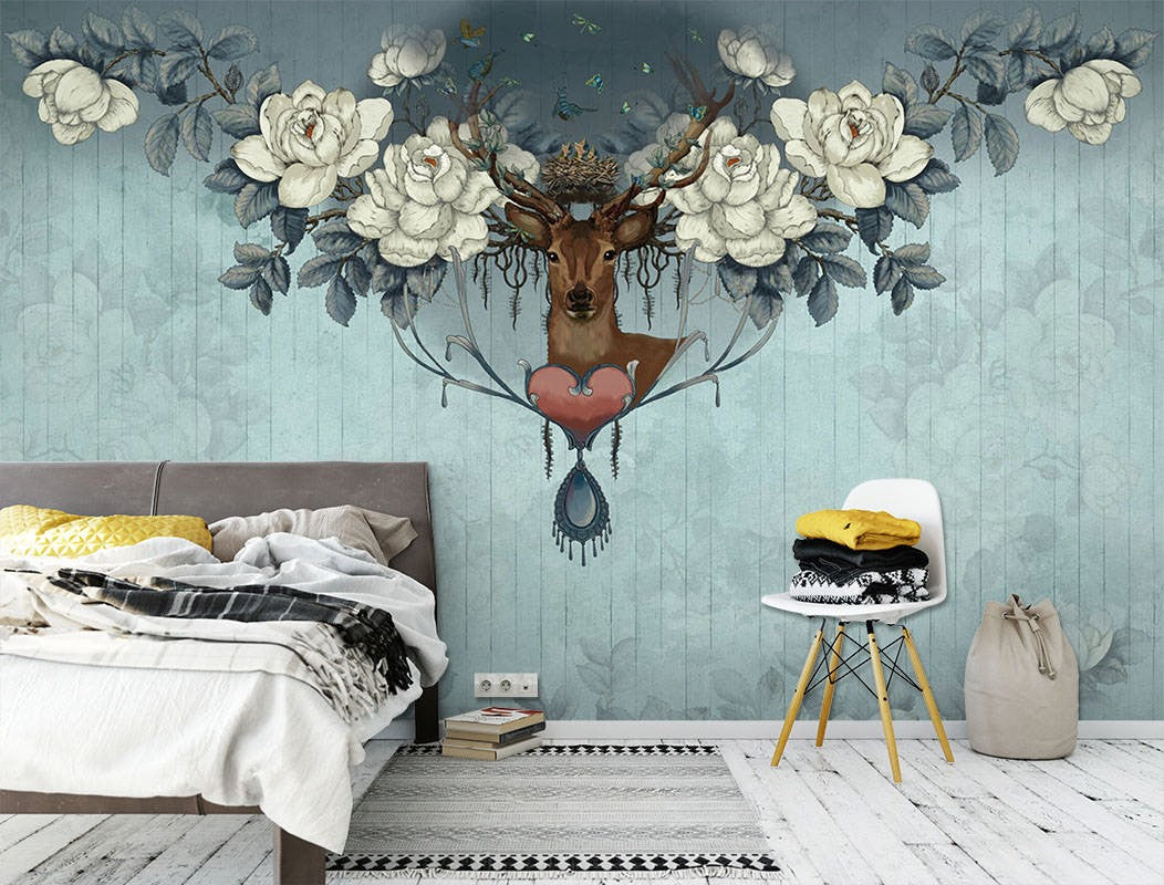 Elk Dutch Flower Art Fantasy Blue Wallpaper Mural,Self-Adhesive Peel And Stick 3D Wall Mural,Australian Company Removable Wall Decor