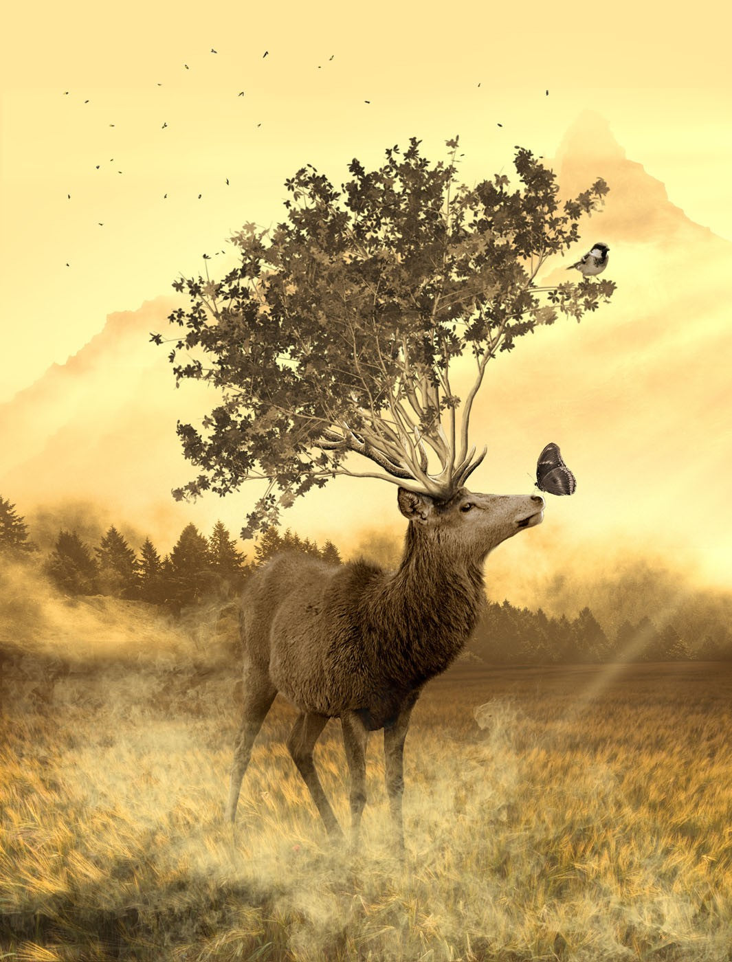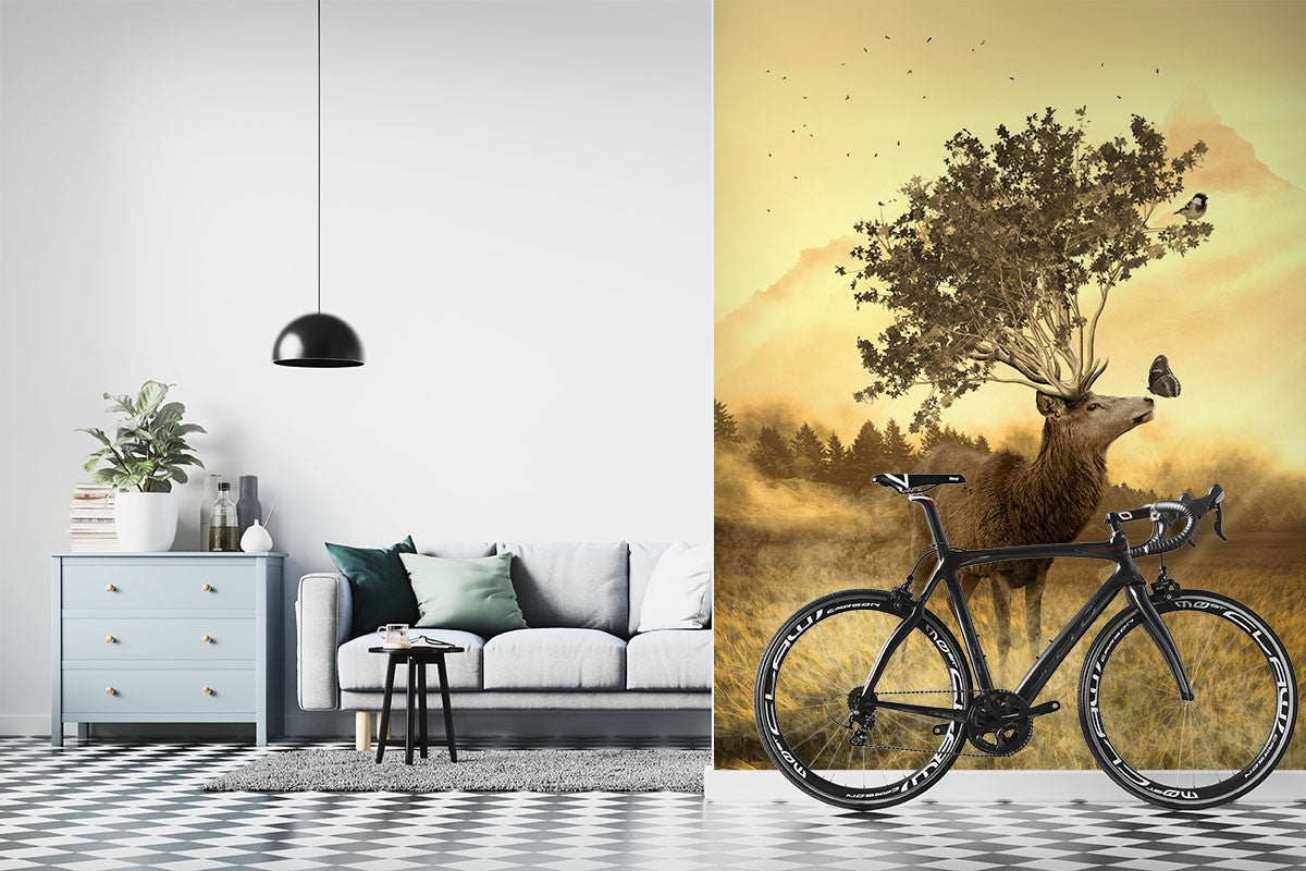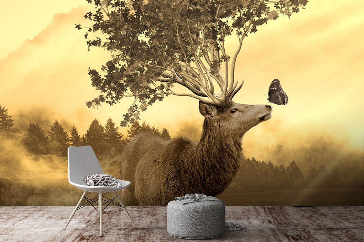 Elk Steppe Fantasy Animals Gold Wallpaper Mural,Self-Adhesive Peel And Stick 3D Wall Mural,Australian Company Removable Wall Decor
