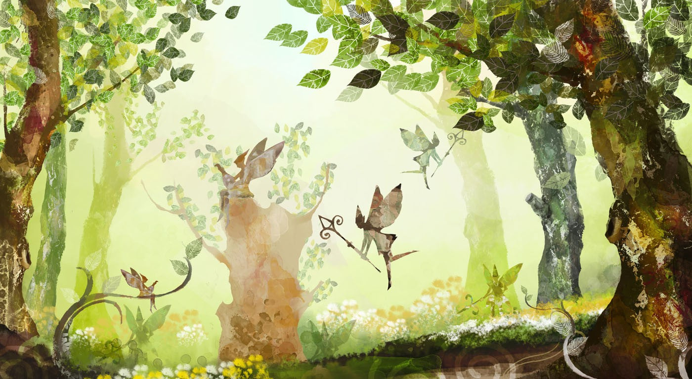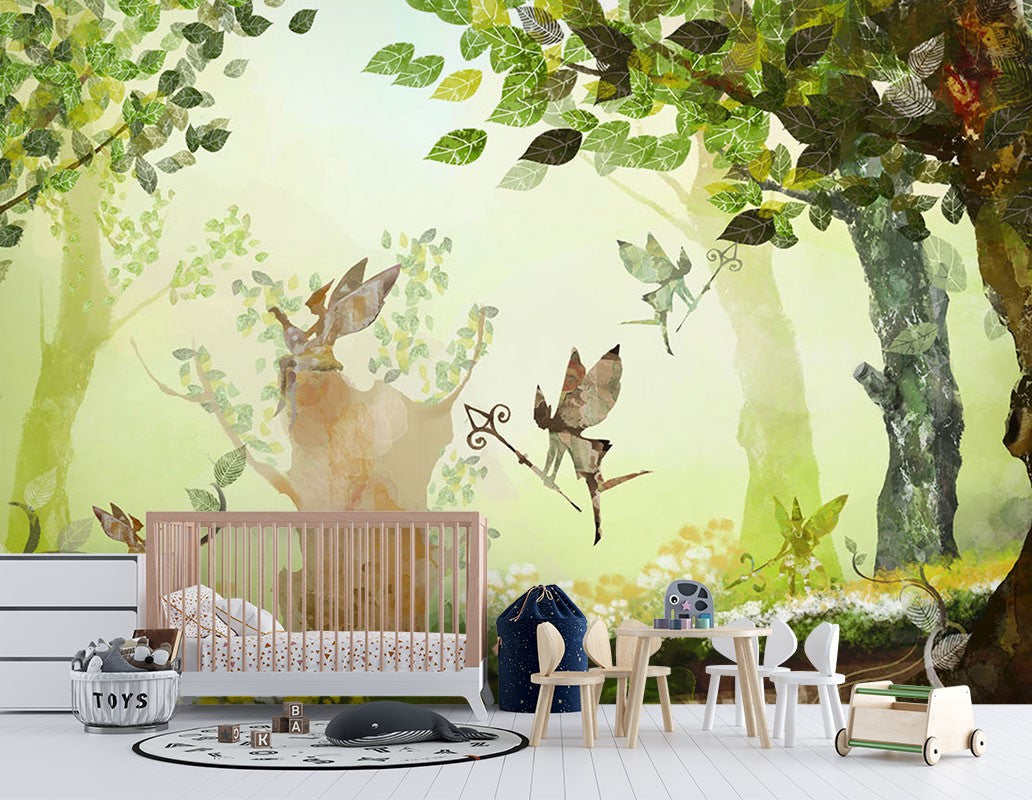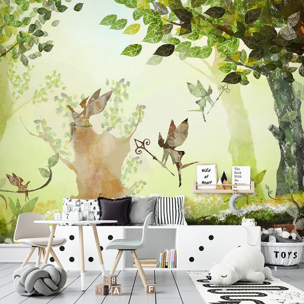 Fairies Trees Kids Fantasy Green Wallpaper Mural,Self-Adhesive Peel And Stick 3D Wall Art,Removable Bedroom Wall Decor
