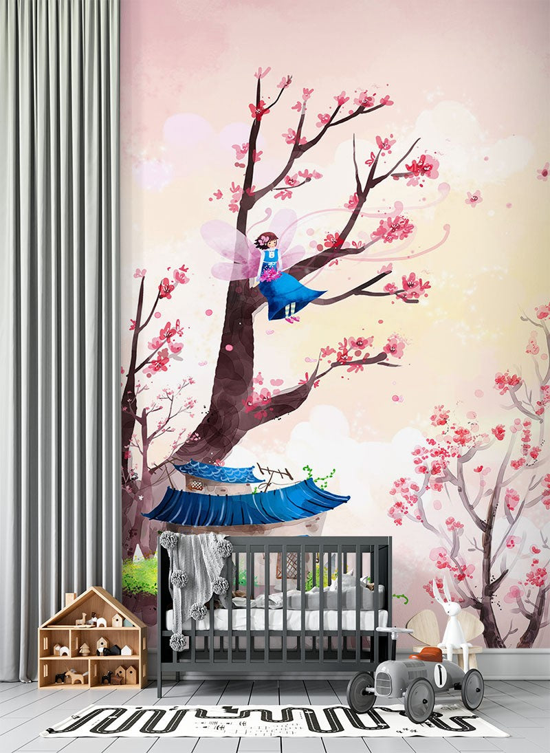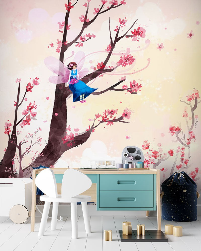 Fairy Blossom Kids Fantasy Pink Wallpaper Mural,Self-Adhesive Peel And Stick 3D Wall Decal,Bedroom Designer Wall Decor