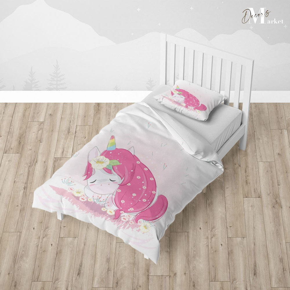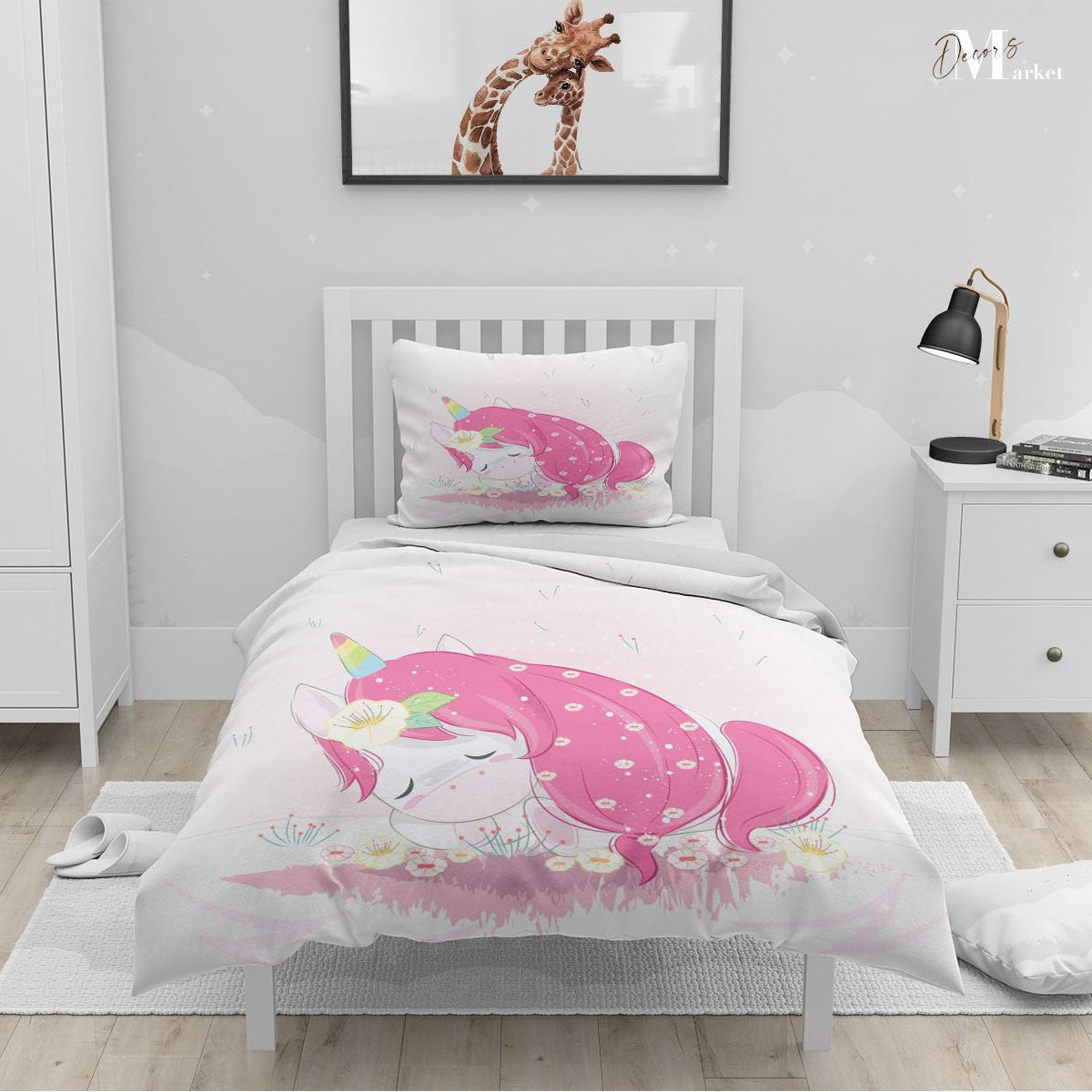 Fairy Unicorn Sleeping Duvet Cover Set w Pillow Cover, Pink Kids Animal 3D Quilt Cover, Single Double Queen King Size Doona Cover