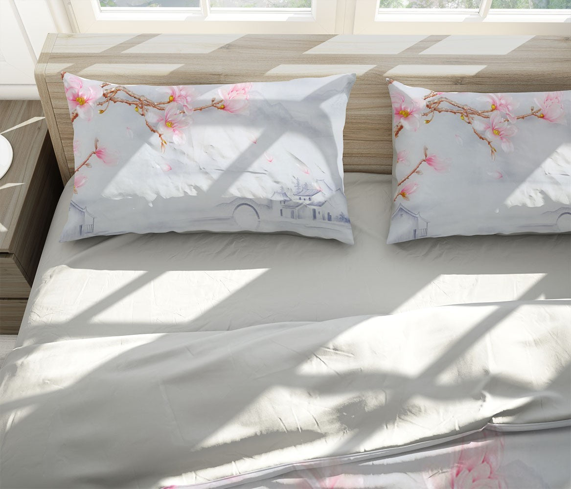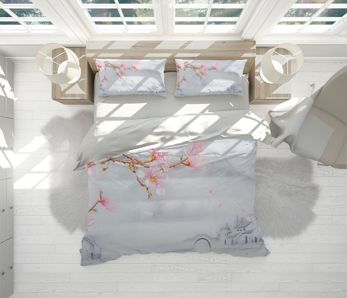 Falling Cherry Duvet Cover Set W Pillow Cover, Pink Art Chinoiserie 3D Quilt Cover, Single Double Queen King Size Doona Cover