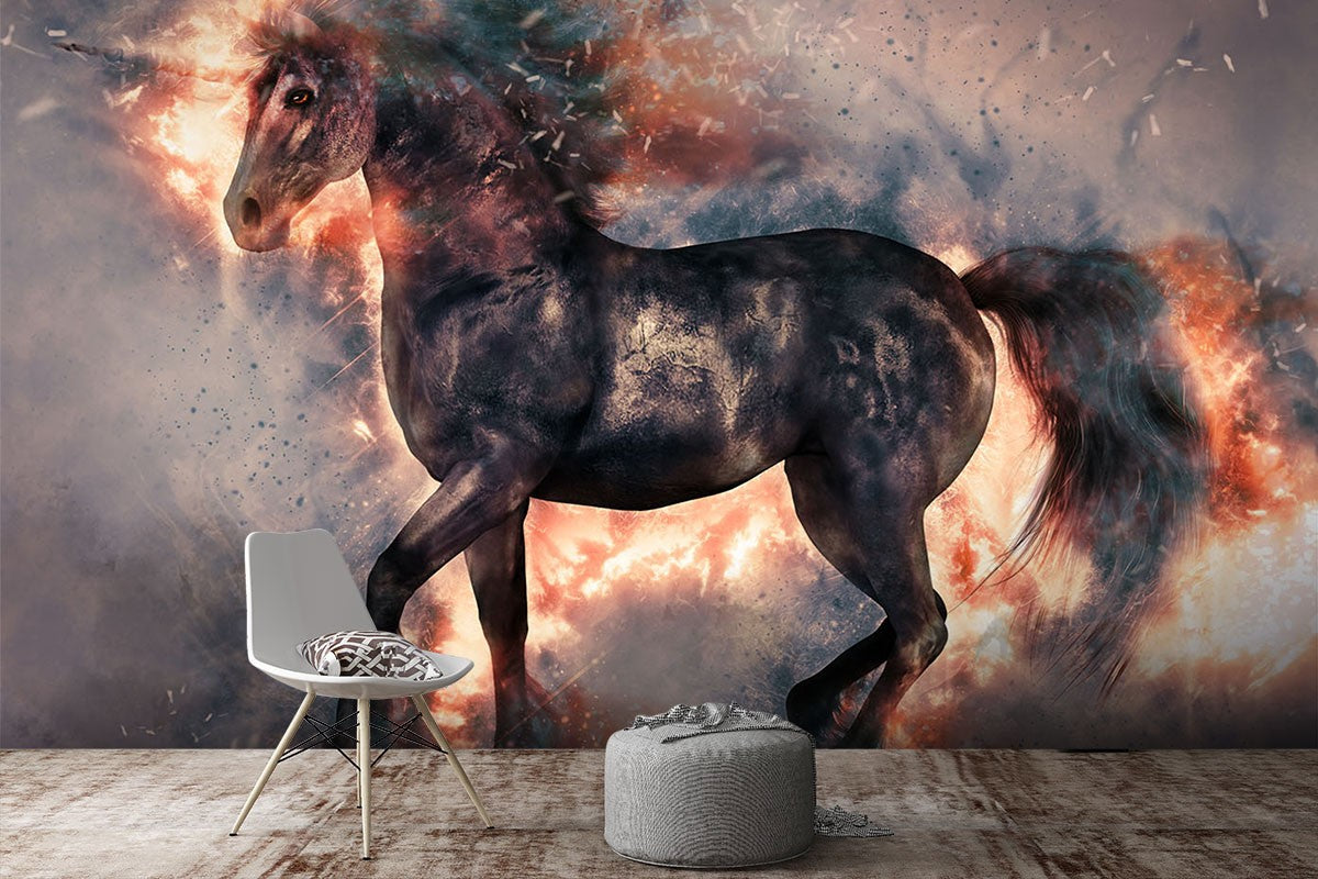 Firey Unicorn Fantasy Animals Brown Wallpaper Mural,Self-Adhesive Peel And Stick 3D Wall Mural,Designer Removable Wall Decor