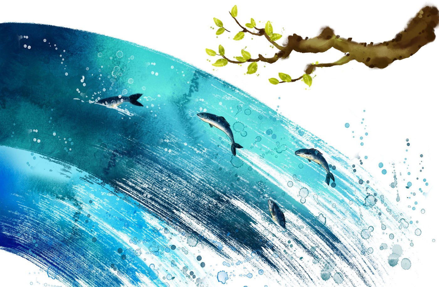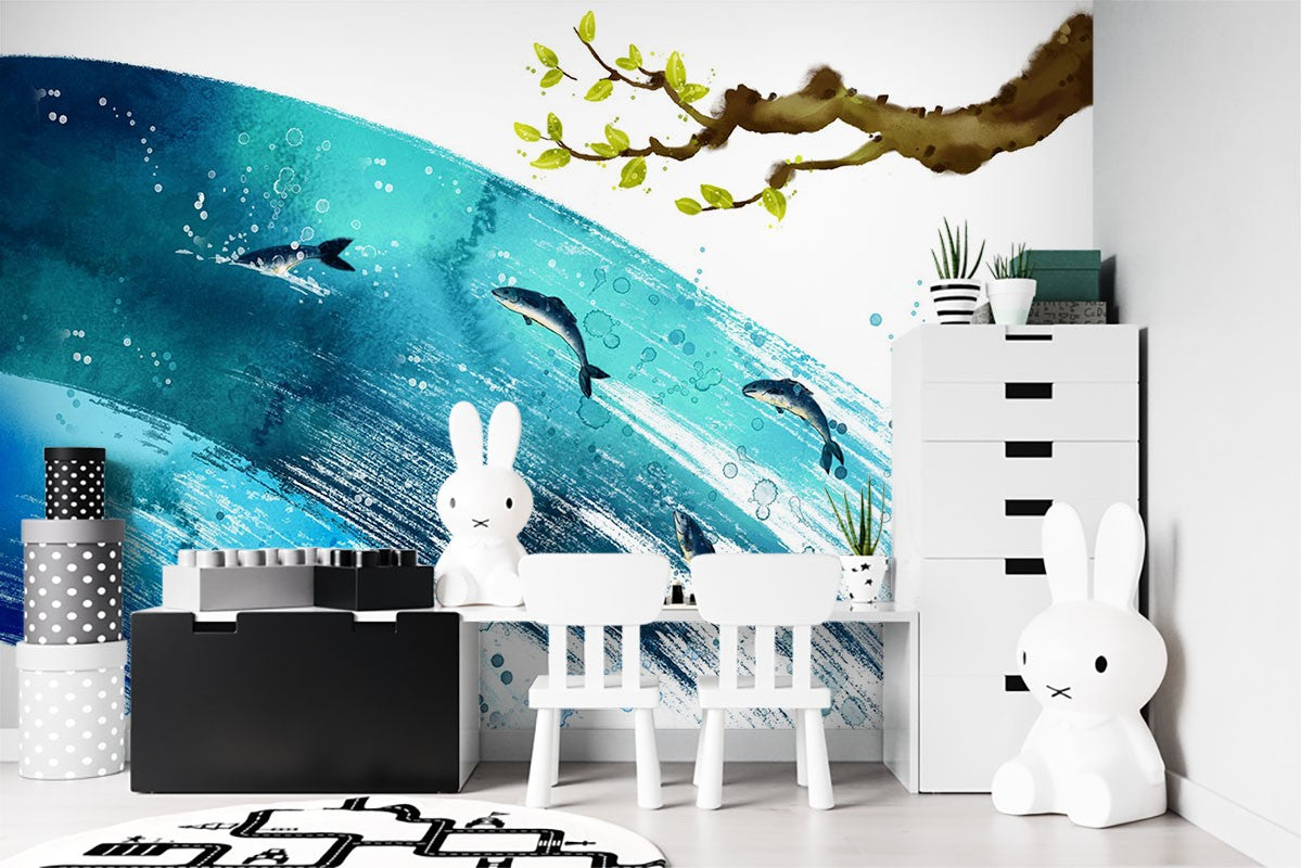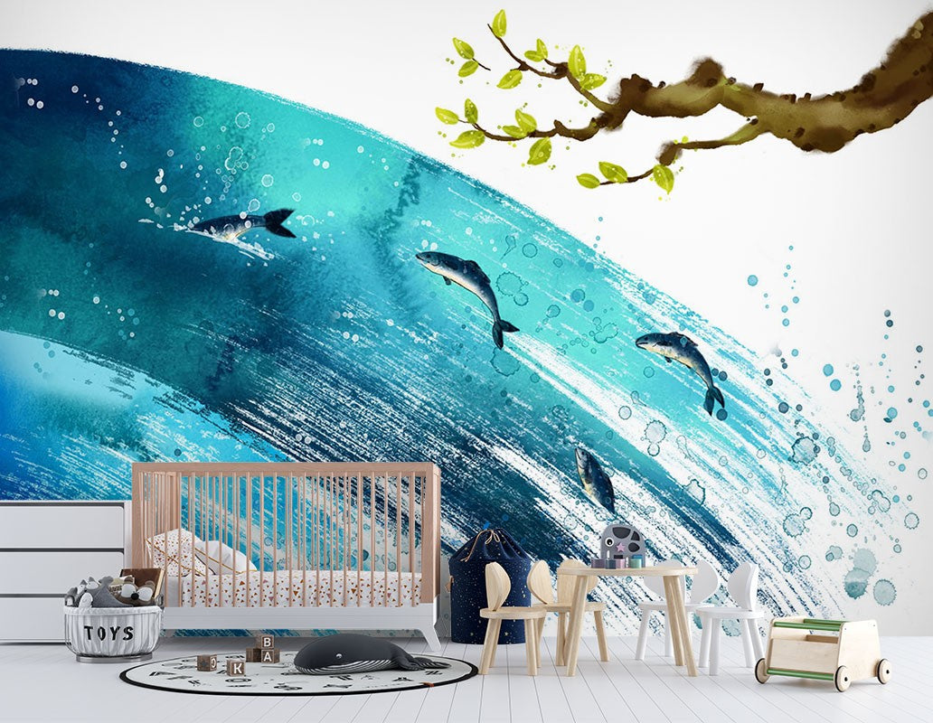 Fish Watercolor Kids Patterns Blue Wallpaper Mural,Self-Adhesive Peel And Stick 3D Wall Paper,Australian Company Removable Wall Decor