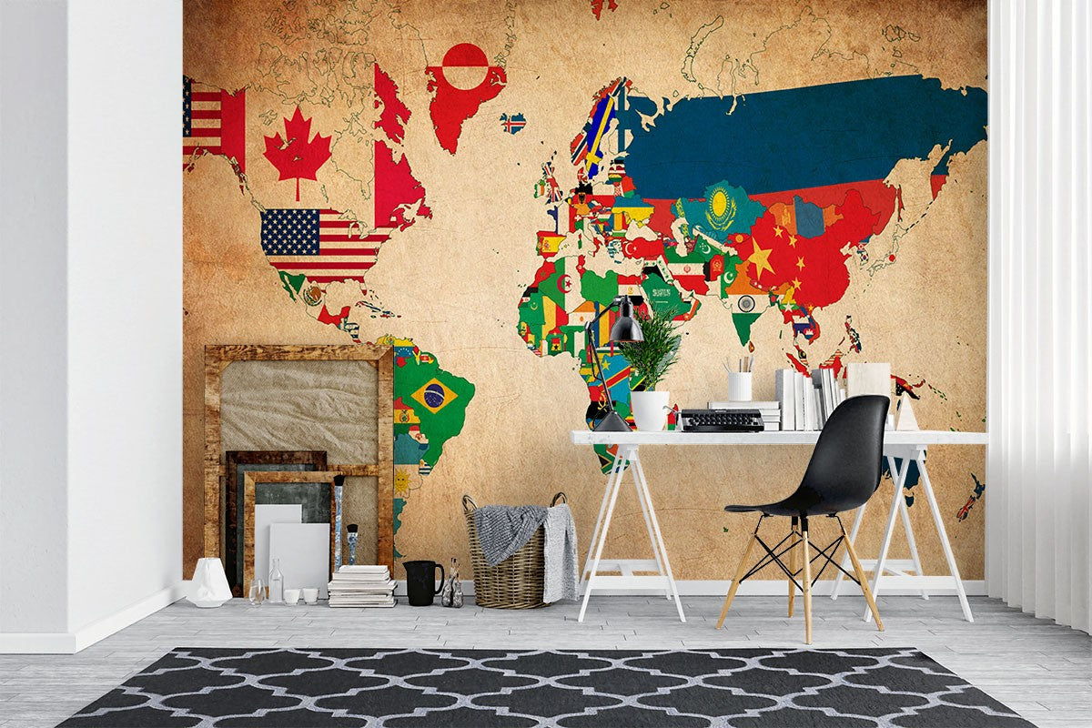 Flag Map Maps Flags Brown Wallpaper Mural,Self-Adhesive Peel And Stick 3D Wall Decal,Designer Bedroom Wall Decor