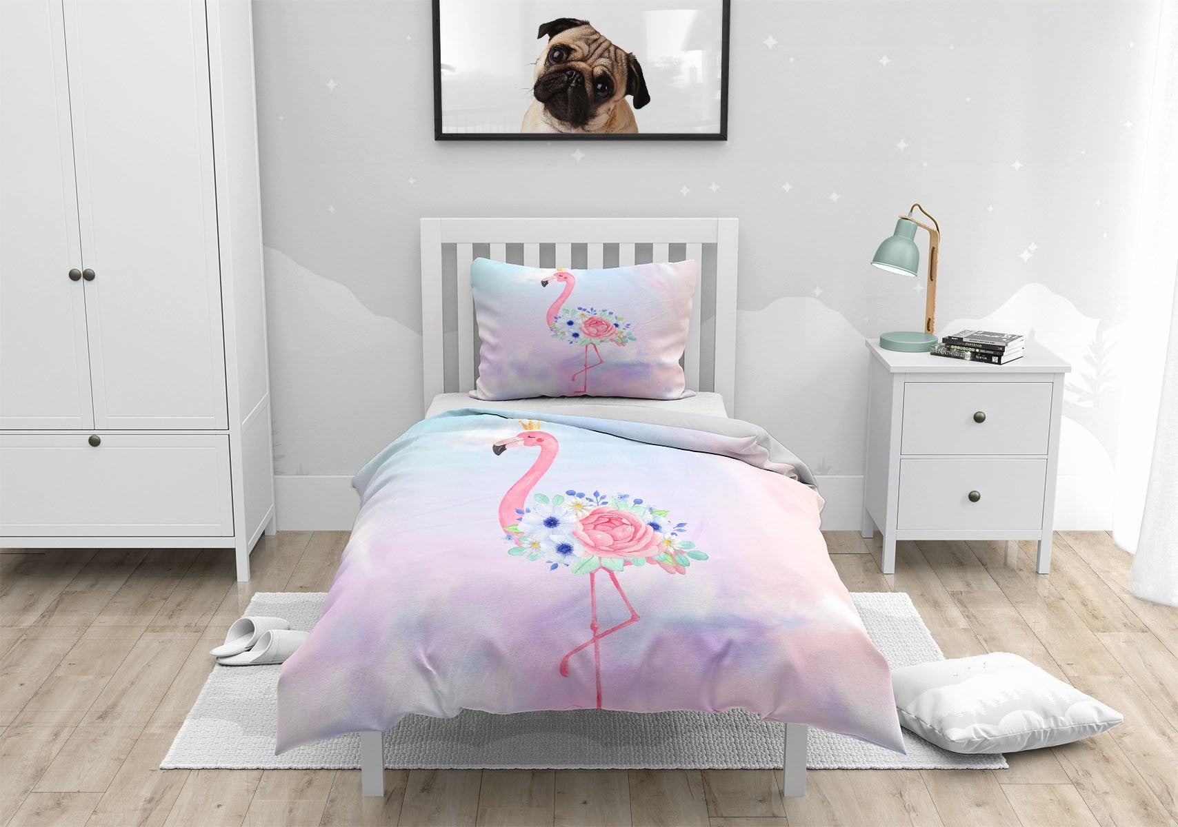 Flamingo Crown Duvet Cover Set w Pillowcases, Pink Kids Animal 3D Quilt Cover, 3pc Single Double Queen King Size Doona Cover